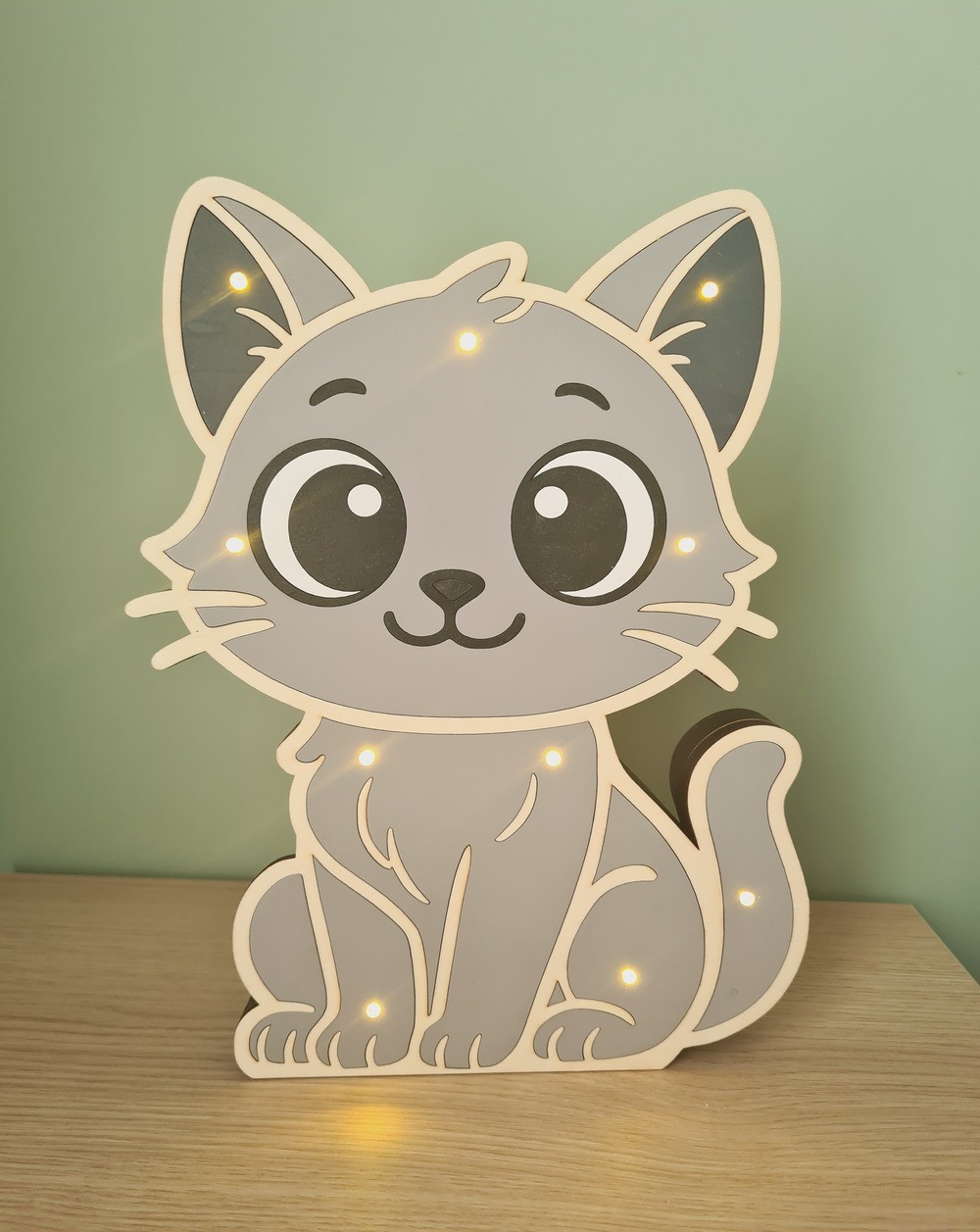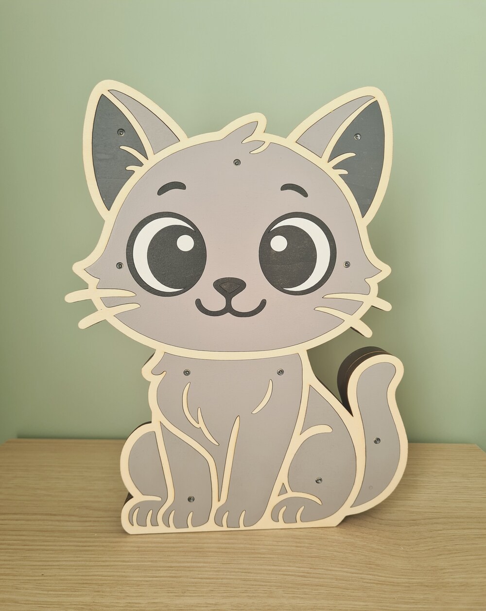 Urocza lampka nocna w kształcie kota to idealne połączenie funkcjonalności i dekoracji do dziecięcego pokoju. Wykonana z naturalnej sklejki oraz płyty HDF, jest trwała, lekka i całkowicie bezpieczna dla najmłodszych. Każda sztuka jest ręcznie malowana farbami spełniającymi normy bezpieczeństwa dla zabawek.