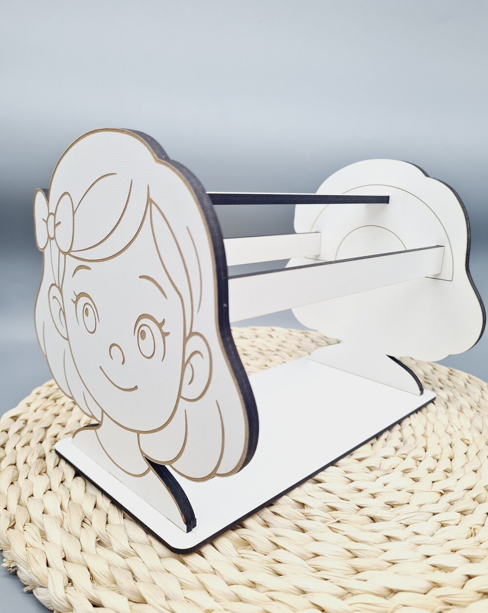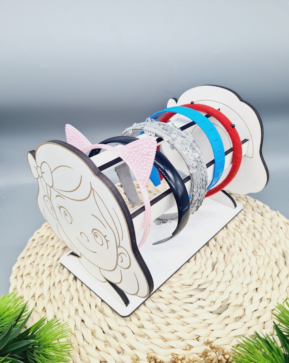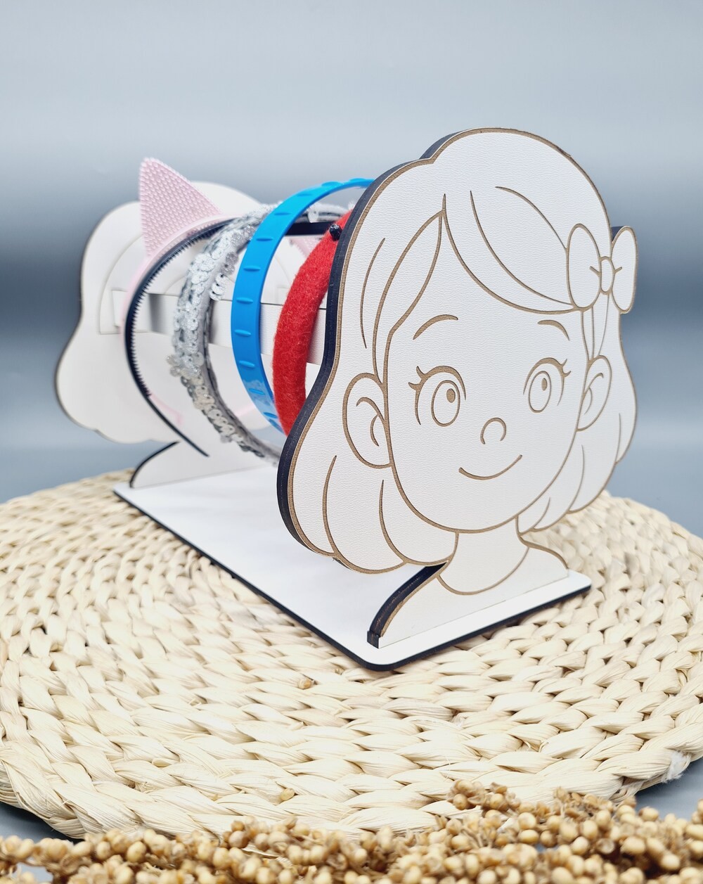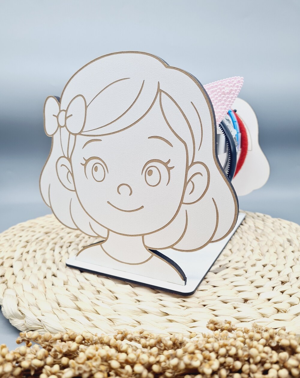 Estetyczny stojak na opaski z trwałej płyty HDF z grawerem dziewczynki to praktyczny i dekoracyjny organizer do pokoju dziewczynki, idealny do przechowywania opasek w uporządkowany sposób.