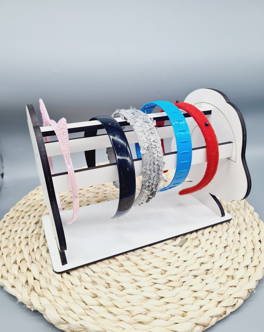 Estetyczny i funkcjonalny stojak na opaski wykonany z trwałej płyty HDF to idealne rozwiązanie do przechowywania dziecięcych opasek do włosów. Dzięki odpowiednio zaprojektowanej konstrukcji organizer pozwala na uporządkowanie opasek w jednym miejscu, co ułatwia ich codzienne użytkowanie.