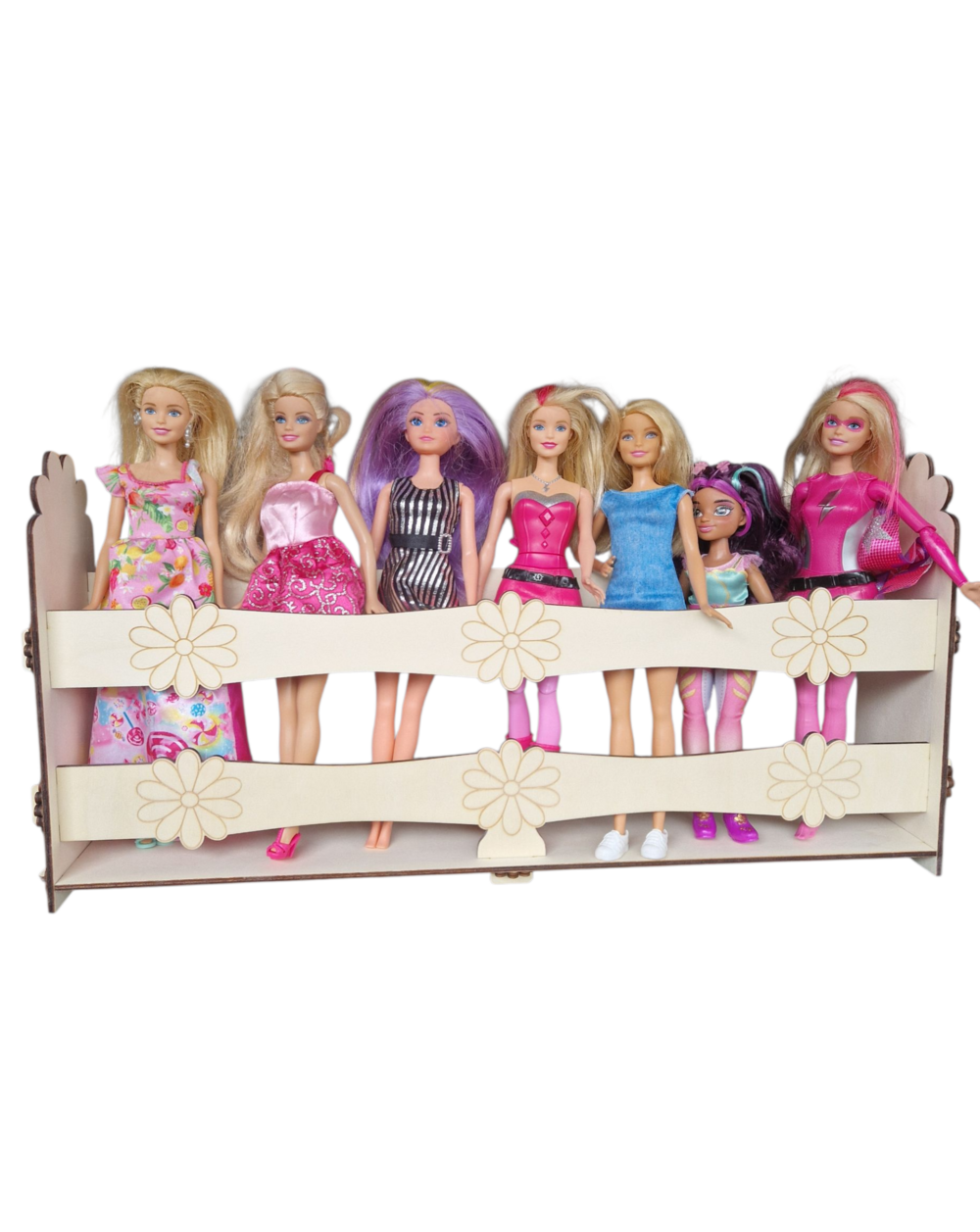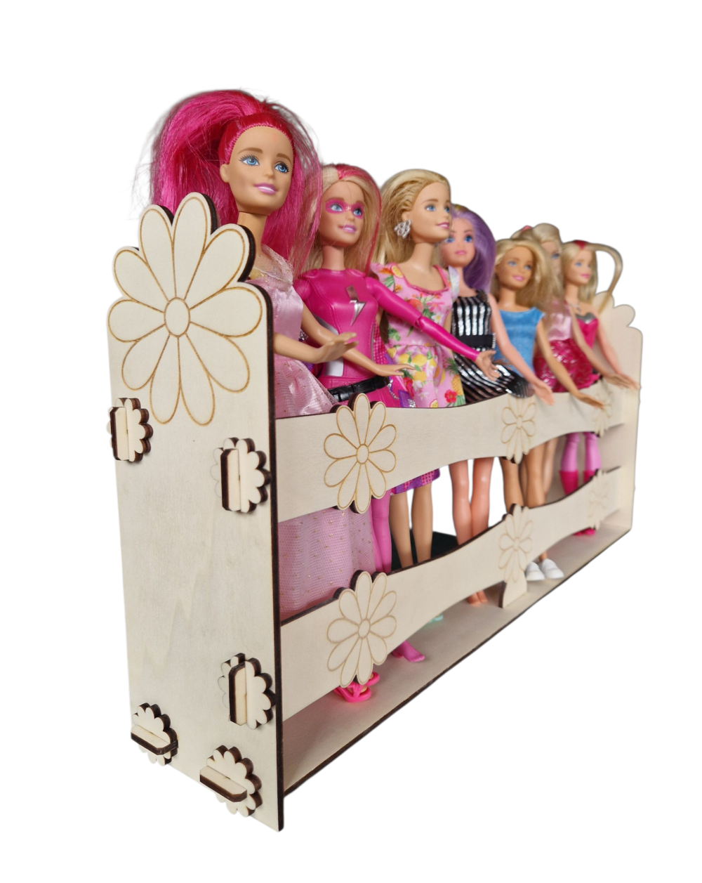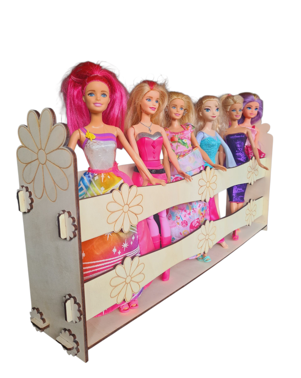 Praktyczny i estetyczny stojak na lalki Barbie, wykonany z trwałej drewnianej sklejki. Idealnie sprawdzi się jako organizer w dziecięcym pokoju – pozwala przechowywać lalki w porządku, jednocześnie stanowiąc piękną dekorację wnętrza.