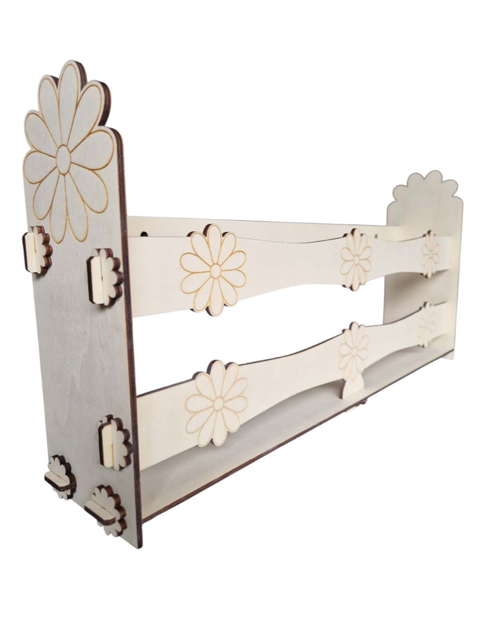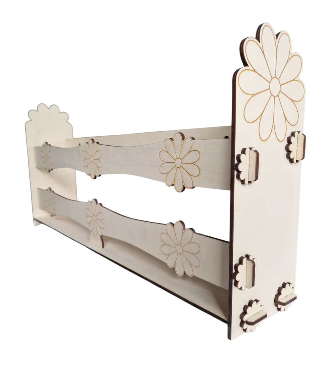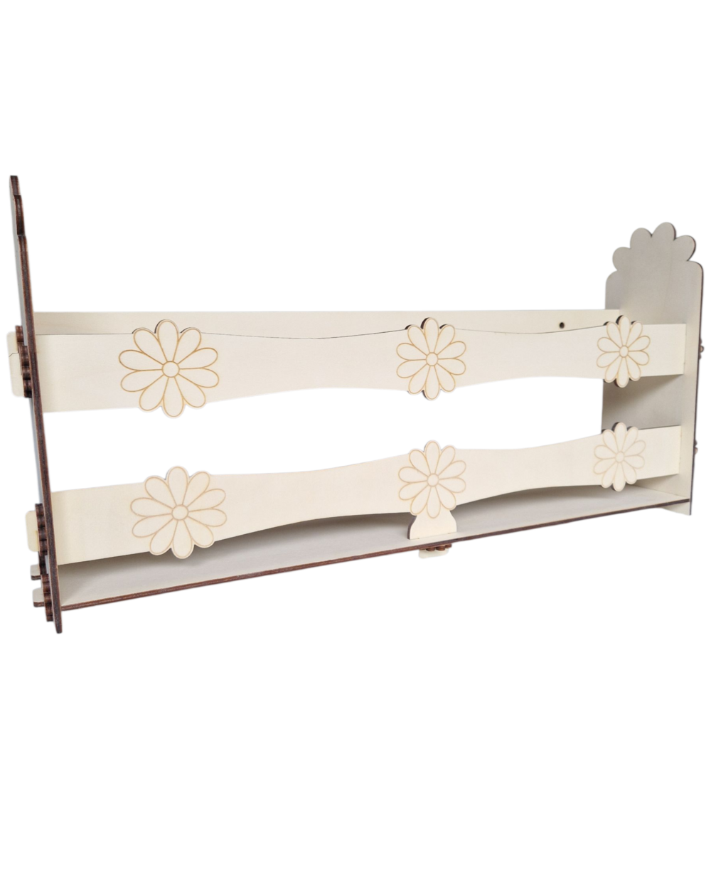 Drewniany stojak na lalki Barbie z grawerem kwiatków, o wymiarach 51 × 26 × 10 cm, można postawić lub powiesić na ścianie (posiada otwory montażowe z tyłu), a dla bezpieczeństwa wysyłany jest w formie do samodzielnego, łatwego montażu z dołączoną instrukcją.