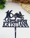 Personalizowany topper na tort z motocyklistą w kasku oraz napisem z wiekiem i imieniem jubilata, wykonany z czarnej, złotej, srebrnej lub białej plexi albo drewnianej sklejki, o wymiarach ok. 15 cm szerokości i 19,5 cm wysokości (z nożką), idealny na urodziny fana motocykli.