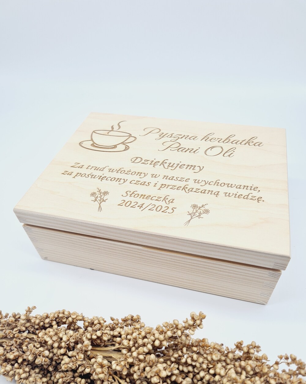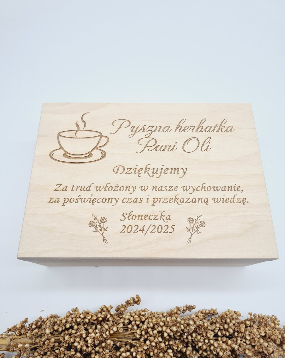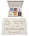 Personalizowana skrzyneczka z herbatką przygotowana specjalnie dla nauczyciela.