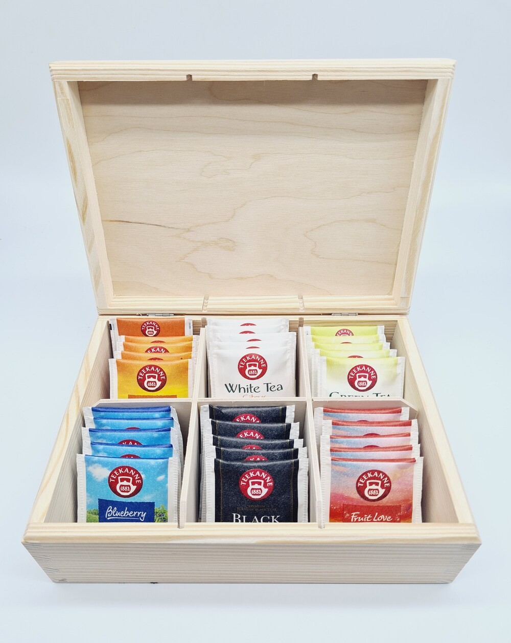 - Zawartość skrzynki: zestaw 30 herbat w różnych smakach, dobieranych losowo z dostępnych wariantów – każda herbaciarka to mała niespodzianka!