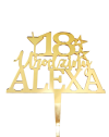 Personalizowany topper urodzinowy z liczbą, imieniem, kieliszkiem i gwiazdkami – elegancka dekoracja tortu dostępna w złotej plexi oraz innych wariantach kolorystycznych.