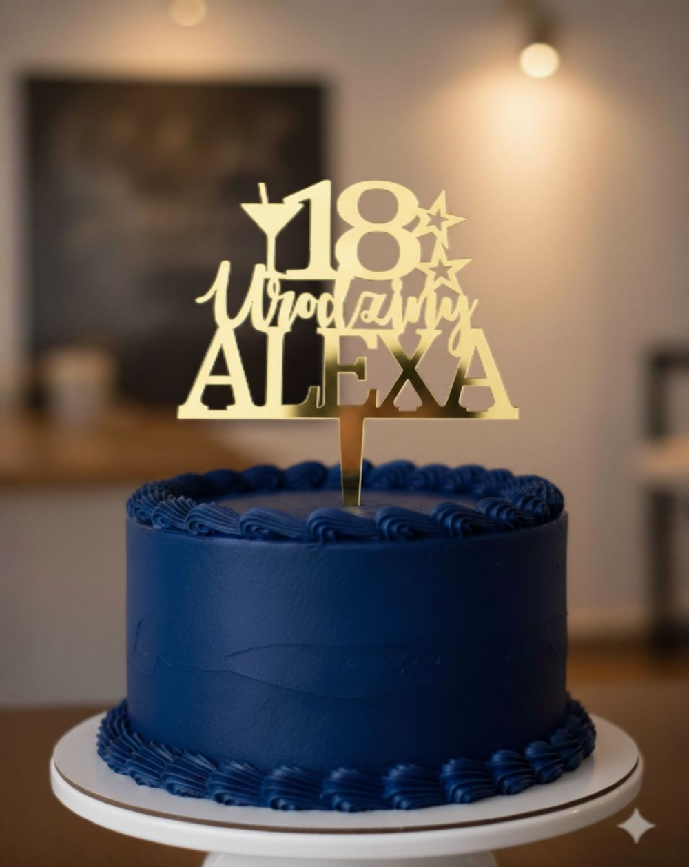 Nie zapomnij zapisać swojej personalizacji, aby móc dodać ją do koszykaPersonalizowany topper na urodziny to wyjątkowa dekoracja, która sprawi, że każdy tort będzie wyglądał niepowtarzalnie. Wzór składa się z napisu „Urodziny” wraz z dowolną liczbą oraz imieniem jubilata, a całość została wzbogacona o elegancki motyw kieliszka i dwie gwiazdki, dzięki czemu topper idealnie wpisuje się w klimat urodzinowej celebracji. Dekoracja ma wymiary około 15 cm szerokości i 19,5 cm wysokości (wraz z nóżką do łatwego wbicia w tort). Standardowo wykonana jest ze złotej plexi o pięknym lustrzanym połysku, ale dostępne są również inne wersje kolorystyczne: srebrna, biała, czarna plexi lub naturalna drewniana sklejka. To efektowny i trwały dodatek, który nada Twojemu przyjęciu elegancji i wyjątkowego charakteru.