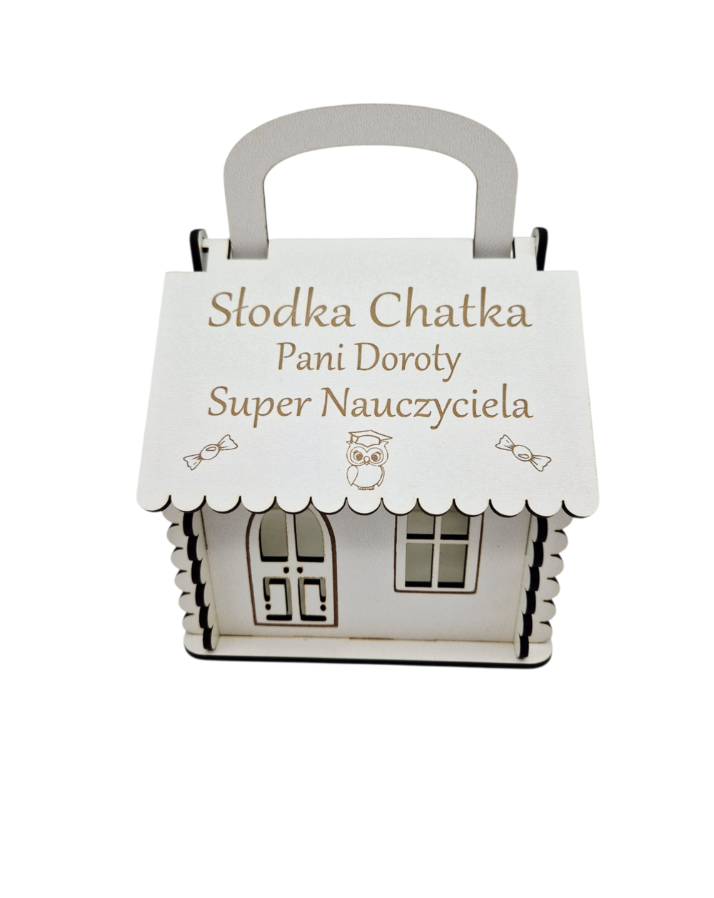 Biała „Słodka Chatka” z możliwością personalizacji, grawerem sowy, cukierków i sentencją to otwierany domek na słodycze z rączką – idealny prezent pełen wdzięczności