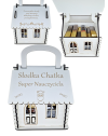 Nie zapomnij zapisać swojej personalizacji, aby móc dodać ją do koszykaSłodka chatka – wyjątkowy domek na słodycze wykonany z białej płyty HDF, który stanowi idealny pomysł na oryginalny i personalizowany upominek. Dzięki otwieranemu dachowi z łatwością można umieścić w nim ulubione słodkości, np. czekoladki Merci czy inne drobiazgi, tworząc niepowtarzalny prezent pełen uroku. Z jednej strony dachu znajduje się grawerowany napis „Słodka Chatka” z możliwością personalizacji, np. „Super Nauczyciela” czy „Pani Krysi”, a także dekoracyjny motyw sowy i dwóch cukierków. Z drugiej strony umieszczono piękną sentencję: „Za wszystkie trudy oraz starania składamy słodkie podziękowania” wraz z miejscem na podpis od osoby lub grupy wręczającej prezent. Domek ma wymiary: wysokość ok. 18,5 cm, długość 13,5 cm i szerokość 13 cm, a praktyczna rączka pozwala na wygodne przenoszenie. To estetyczne i funkcjonalne opakowanie, które sprawi, że każda słodycz nabierze wyjątkowego charakteru. Uwaga: słodycze widoczne na zdjęciach nie są częścią zestawu i nie są wliczone w cenę.