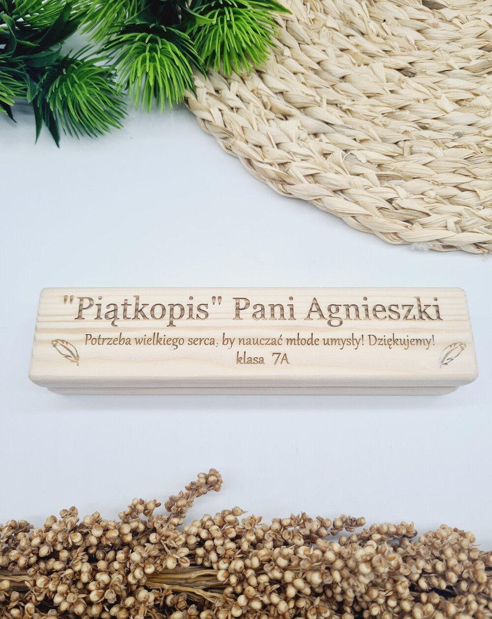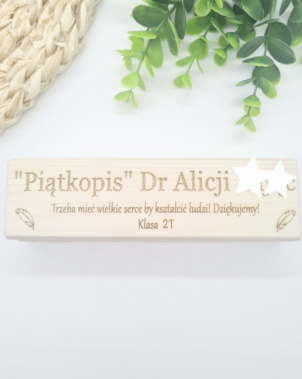 - Personalizowany Grawer: każde pudełko jest starannie wygrawerowane wesołym napisem "Piątkopis" oraz imieniem nauczycielki/nauczyciela, co nadaje mu unikalny i osobisty charakter.