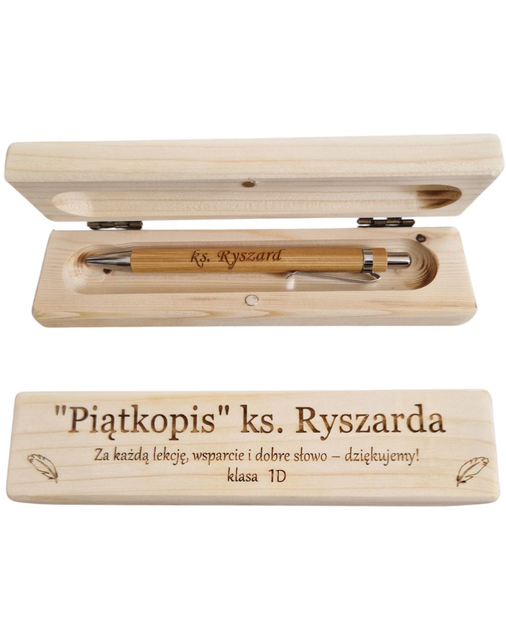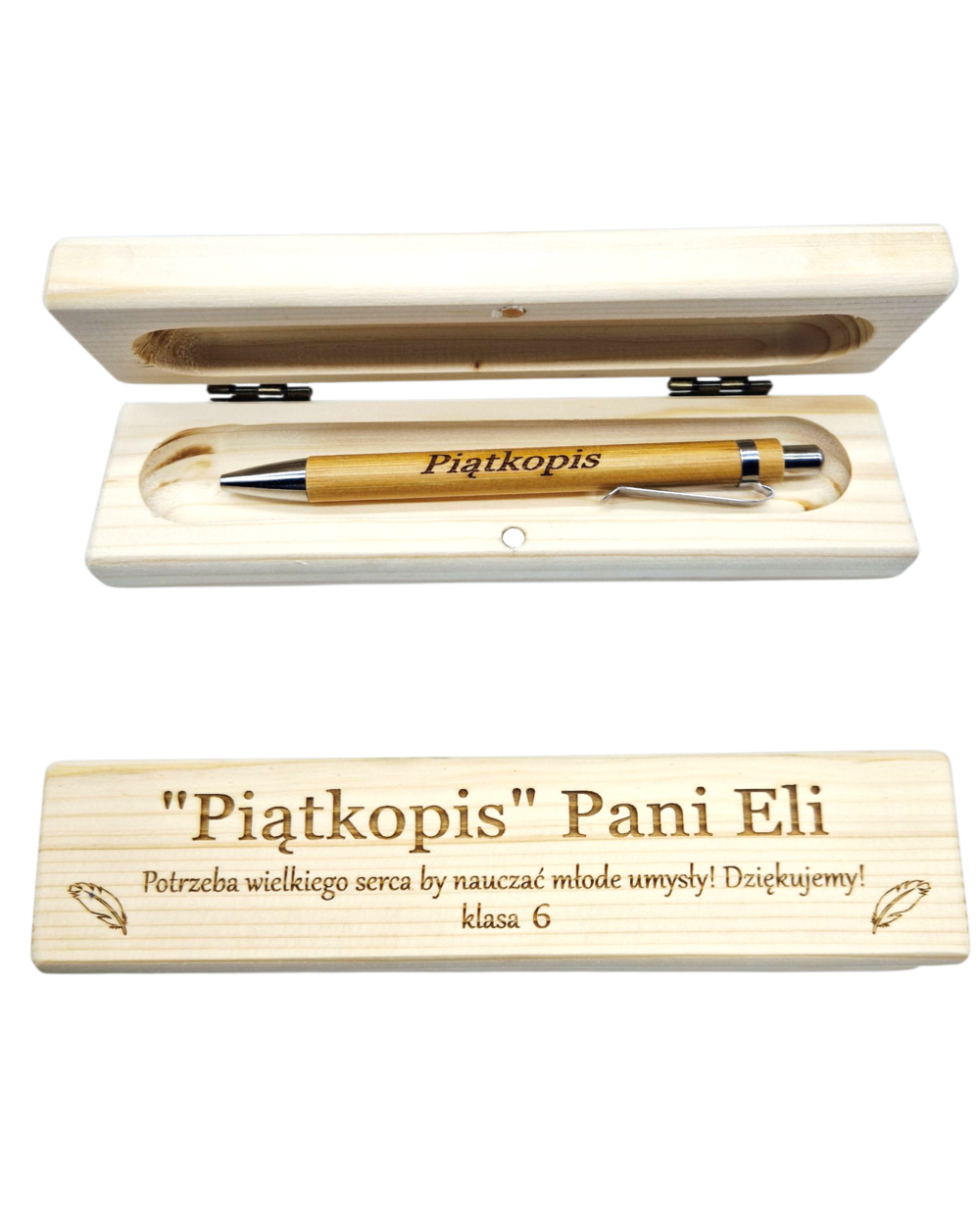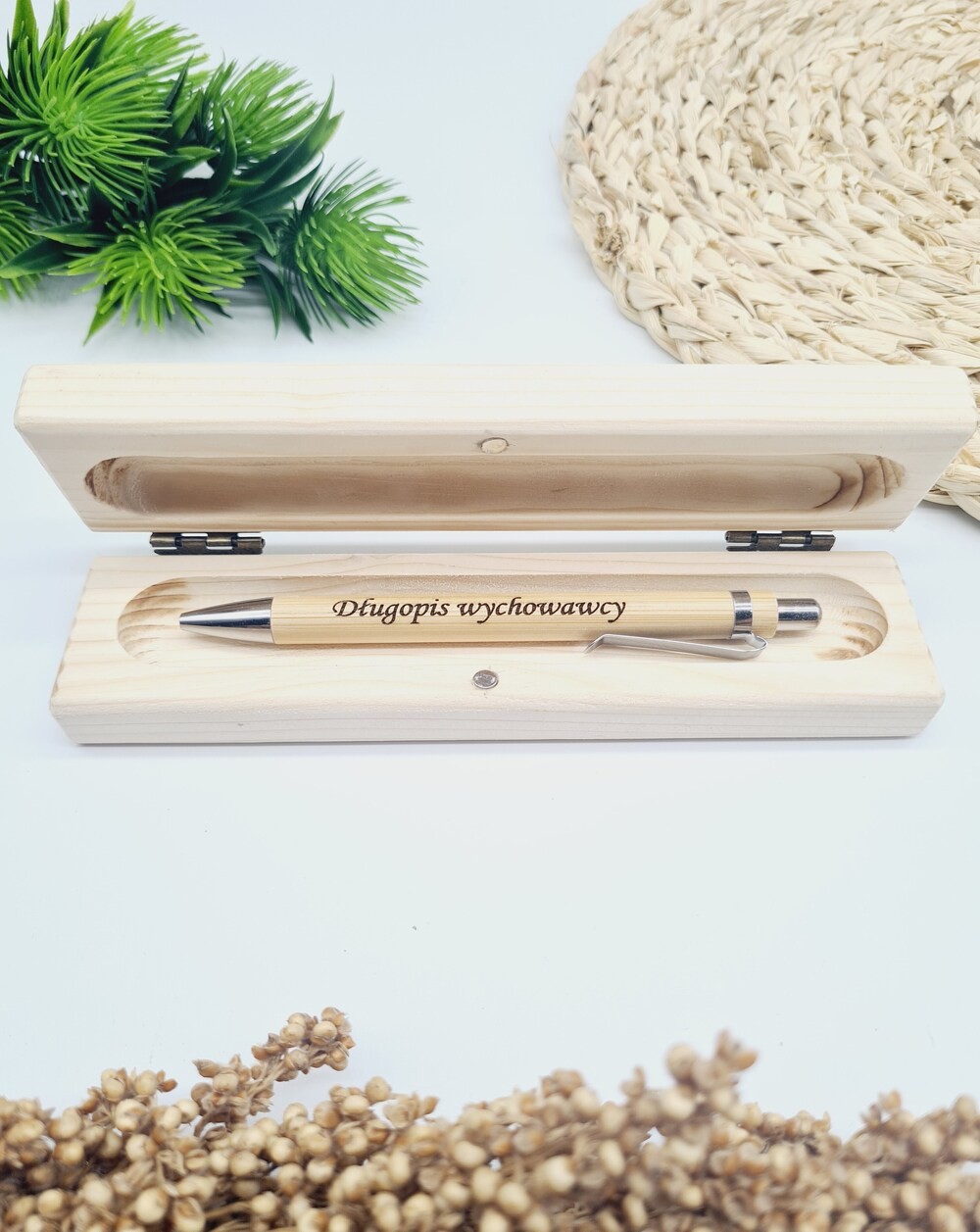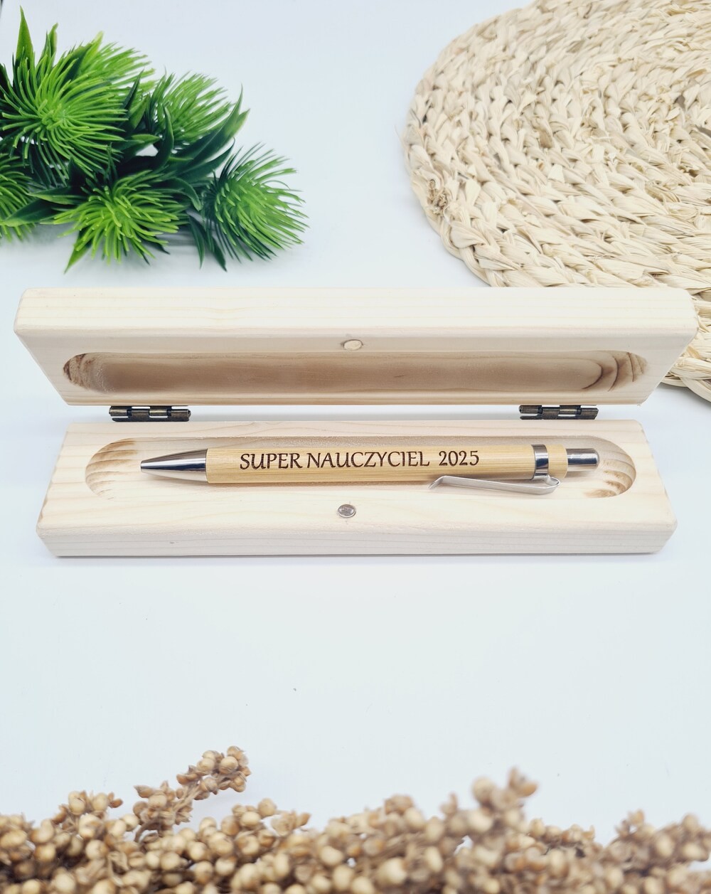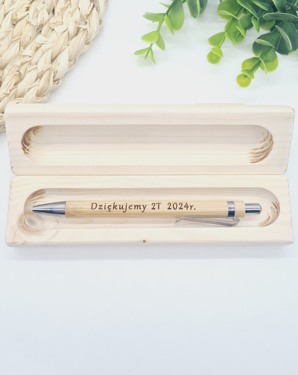 - Długopis z drewna bambusowego: w środku pudełka znajduje się stylowy, ekologiczny długopis wykonany z drewna bambusowego, również z personalizowanym grawerem. To nie tylko praktyczny, ale i elegancki dodatek.