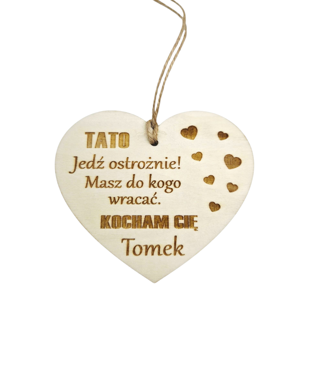 Zawieszka do auta z drewnianej sklejki w kształcie serca (9x10 cm) z personalizowanym grawerem – imieniem adresata, napisem „Jedź ostrożnie. Masz do kogo wracać. Kocham Cię (podpis)” – to wyjątkowy i trwały upominek pełen emocji i troski.