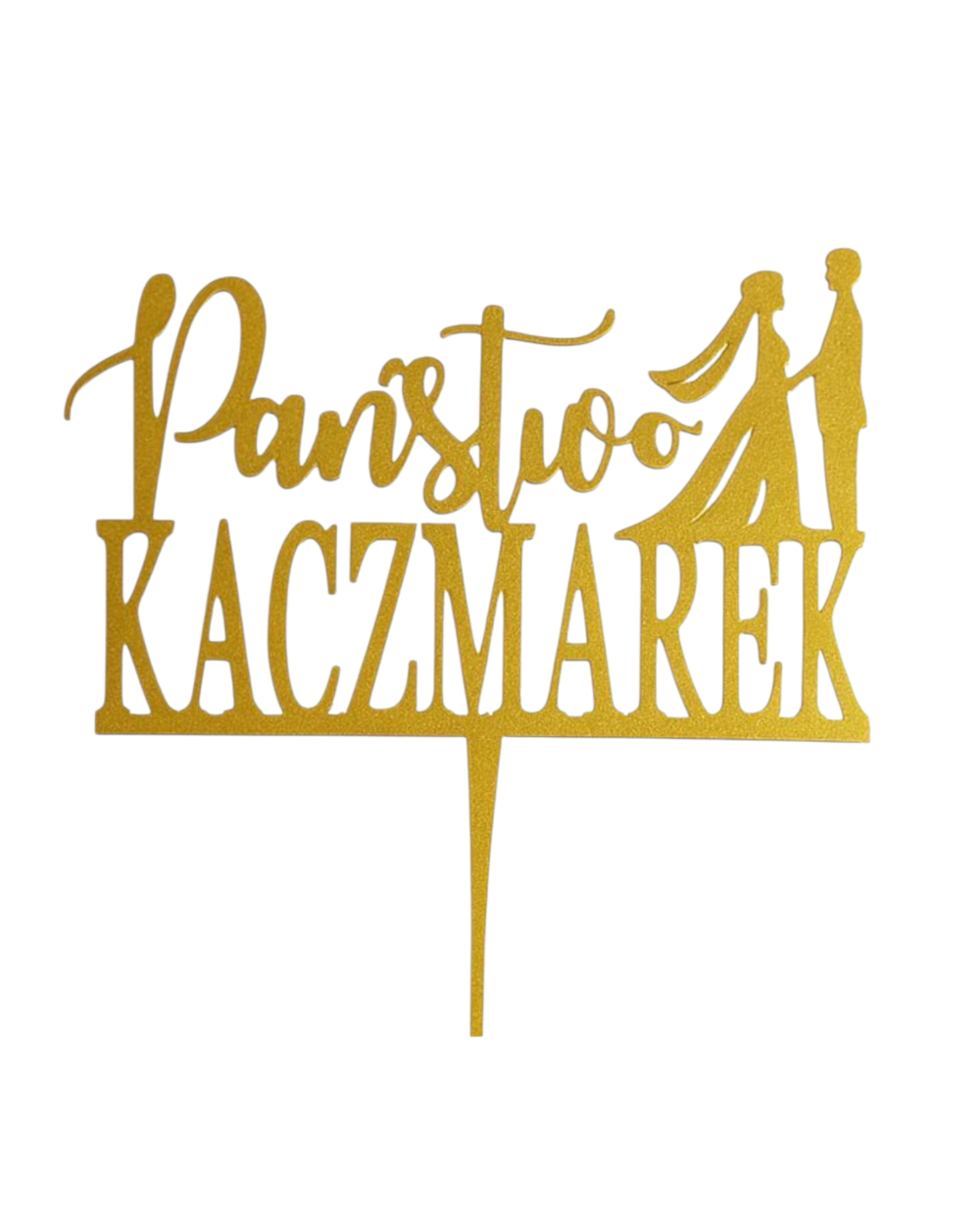Personalizowany topper na tort ślubny z napisem „Państwo [Nazwisko]” i sylwetką pary młodej, wykonany z plexi (złotej, srebrnej, białej, czarnej) lub drewna.