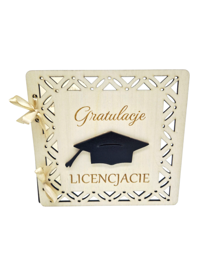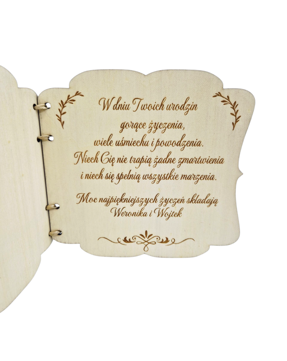 Kartka wykonana jest z naturalnej drewnianej sklejki, co nadaje jej elegancki i ponadczasowy charakter. Obie części połączone są ozdobną wstążeczką, a w zestawie znajduje się także dopasowana koperta, co sprawia, że produkt jest kompletny i od razu gotowy do podarowania.