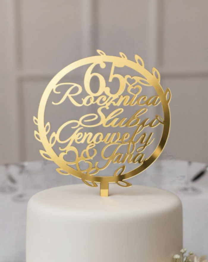 Standardowo wykonywany jest z eleganckiej czarnej plexi, ale dostępne są również inne warianty: złota plexi, srebrna plexi, biała plexi oraz drewniana sklejka. Dzięki temu bez trudu dopasujesz dekorację do stylu swojego przyjęcia i kolorystyki tortu.
