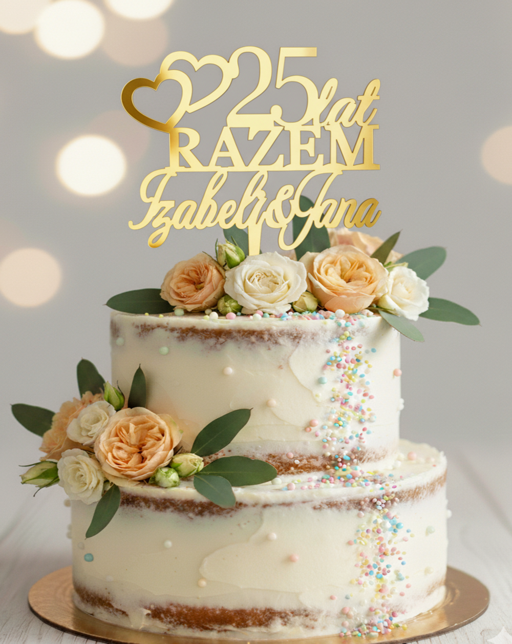 Elegancki topper na tort na Rocznicę Ślubu z napisem RAZEM, imionami solenizantów i liczbą rocznicy, dostępny w złotej, srebrnej, białej, czarnej plexi lub drewnianej sklejce.