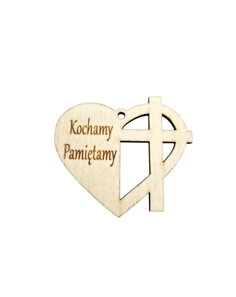 Elegancka i symboliczna zawieszka w kształcie serduszka z krzyżem oraz grawerem „Kochamy, Pamiętamy”. Wykonana z naturalnej drewnianej sklejki, stanowi piękną formę upamiętnienia bliskich.