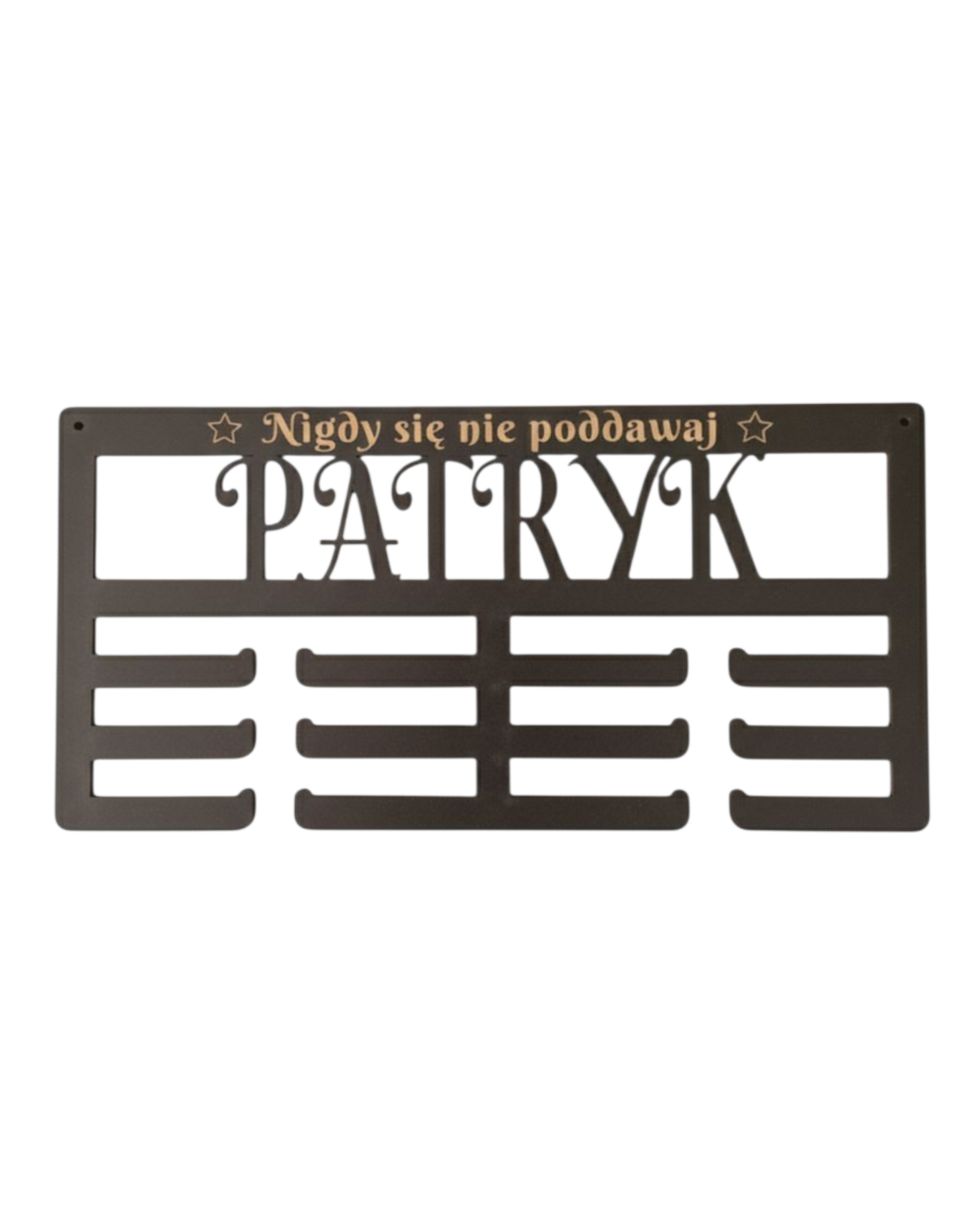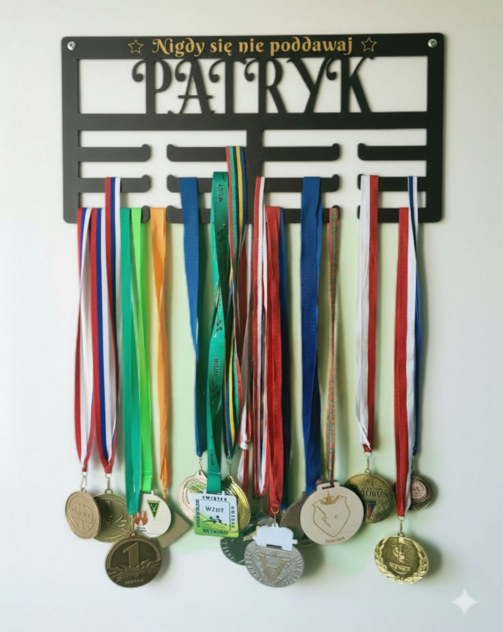 Personalizowany wieszak na medale z imieniem o wymiarach 46x24 cm, wykonany z płyty HDF 6 mm, z motywującym napisem „Nigdy się nie poddawaj” – idealny prezent dla sportowca do efektownego eksponowania medali i sportowych osiągnięć.