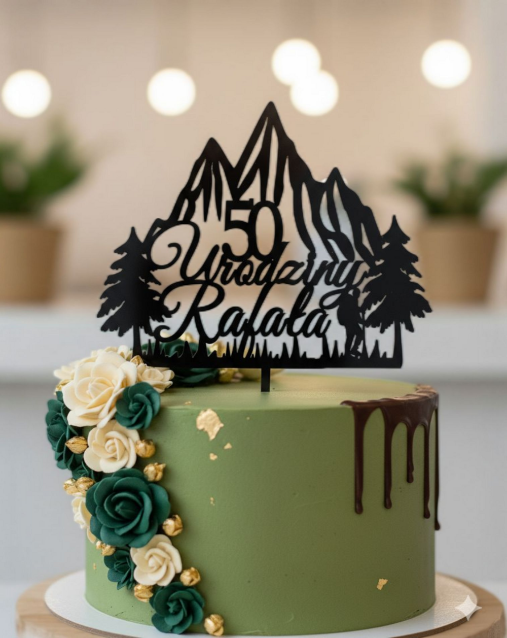 Personalizowany topper na tort z motywem gór i lasu, wykonany z plexi lub drewnianej sklejki, z imieniem i wiekiem solenizanta – idealna ozdoba na wyjątkowe urodziny.