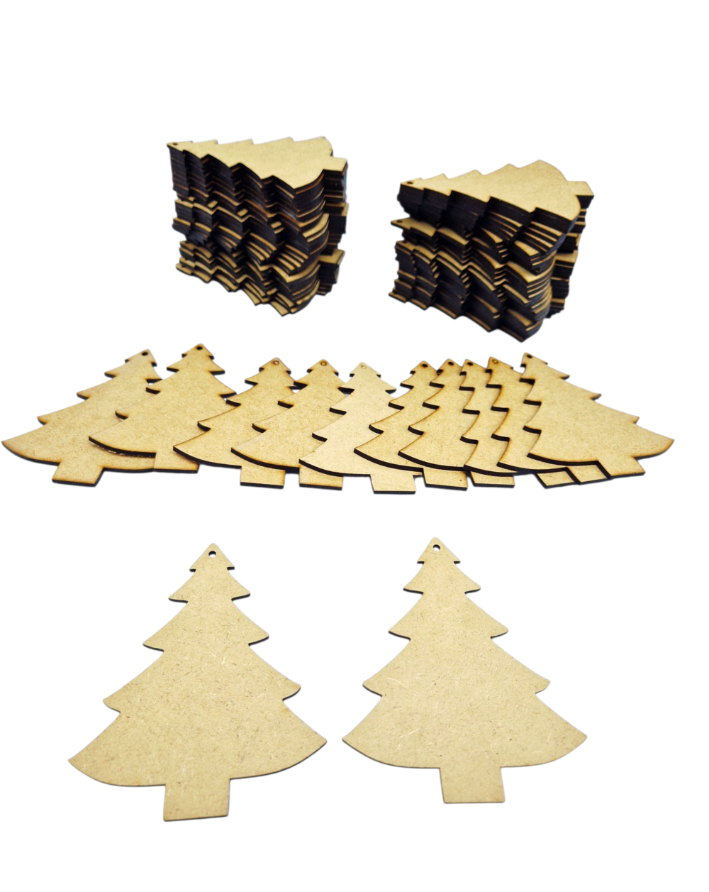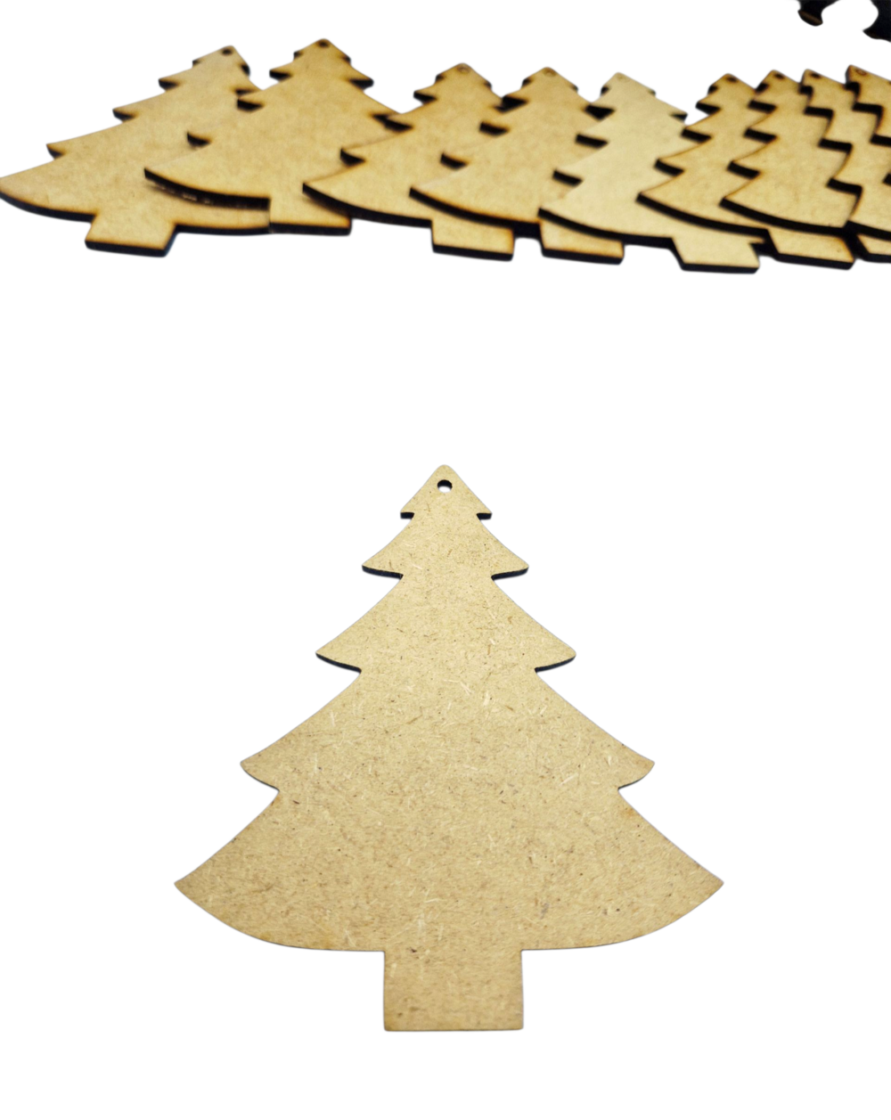Baza do prac plastycznych w kształcie choinki, wykonana z płyty HDF. Wymiary ok. 11 × 9 cm. Choinka posiada dziurkę do zawieszenia – idealna do malowania, dekorowania i tworzenia świątecznych ozdób.