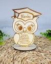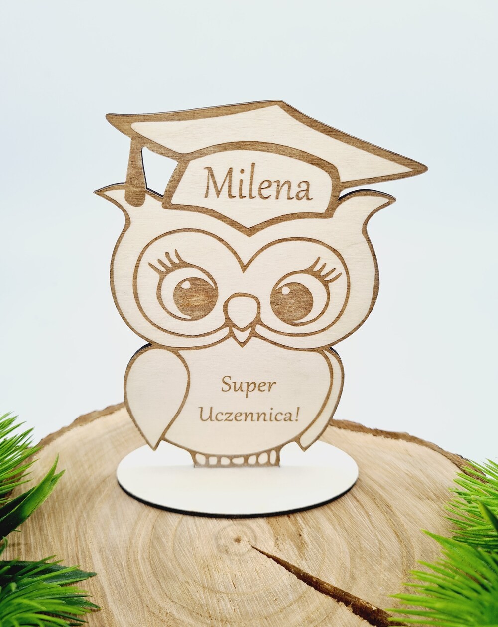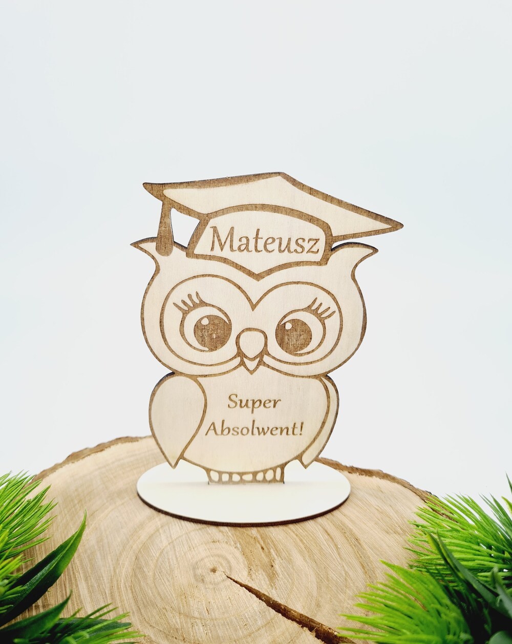 * na brzuchu sowy: znajduje się tekst "Pamiątka ukończenia szkoły..." lub "Pamiątka ukończenia przedszkola...", co czyni statuetkę uniwersalnym i trwałym wspomnieniem tego wyjątkowego wydarzenia.