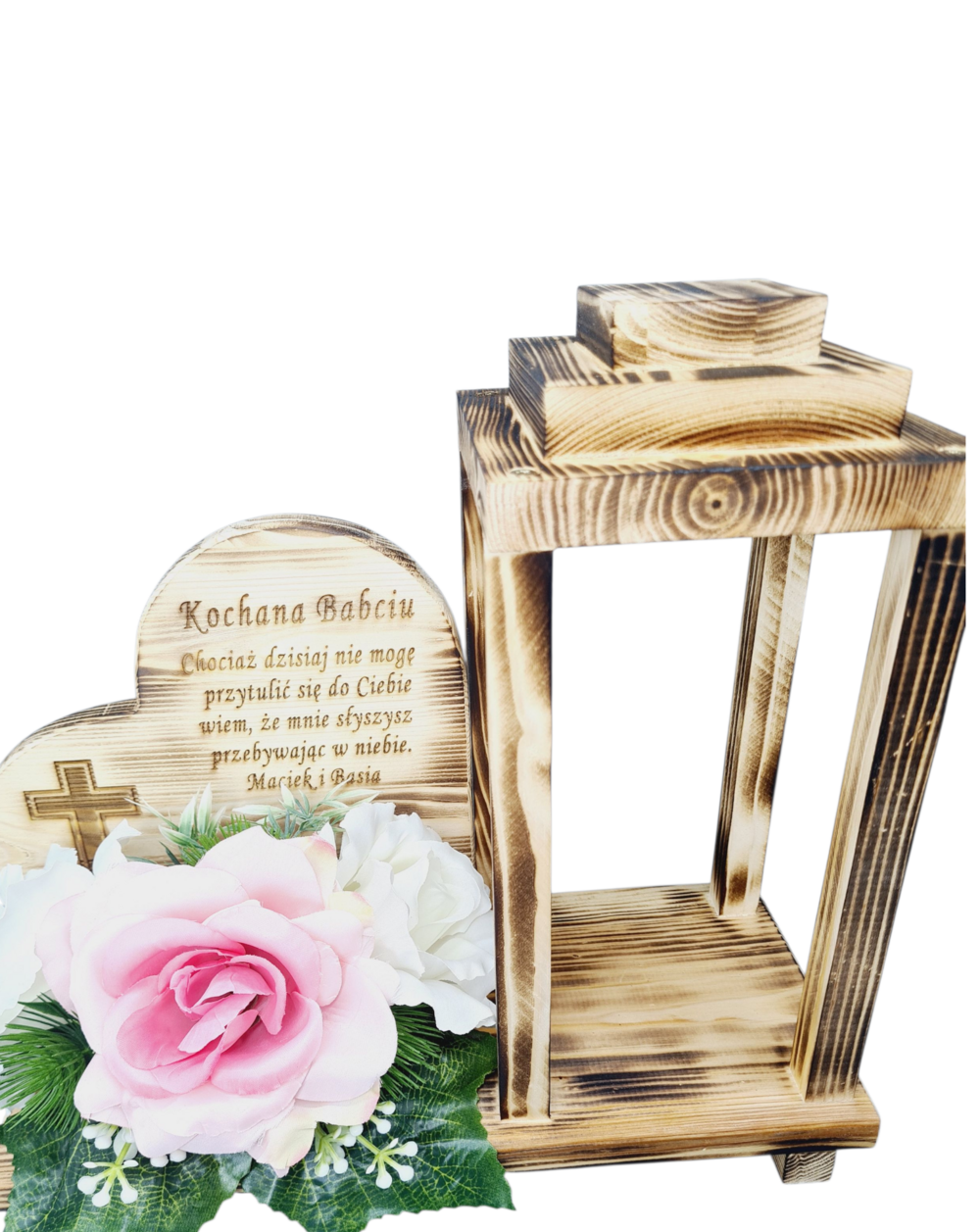 Nie zapomnij zapisać swojej personalizacji, aby móc dodać ją do koszykaPiękny stroik nagrobny z drewnianym, opalanym lampionem oraz drewnianym sercem z grawerowanym, wzruszającym wierszem: