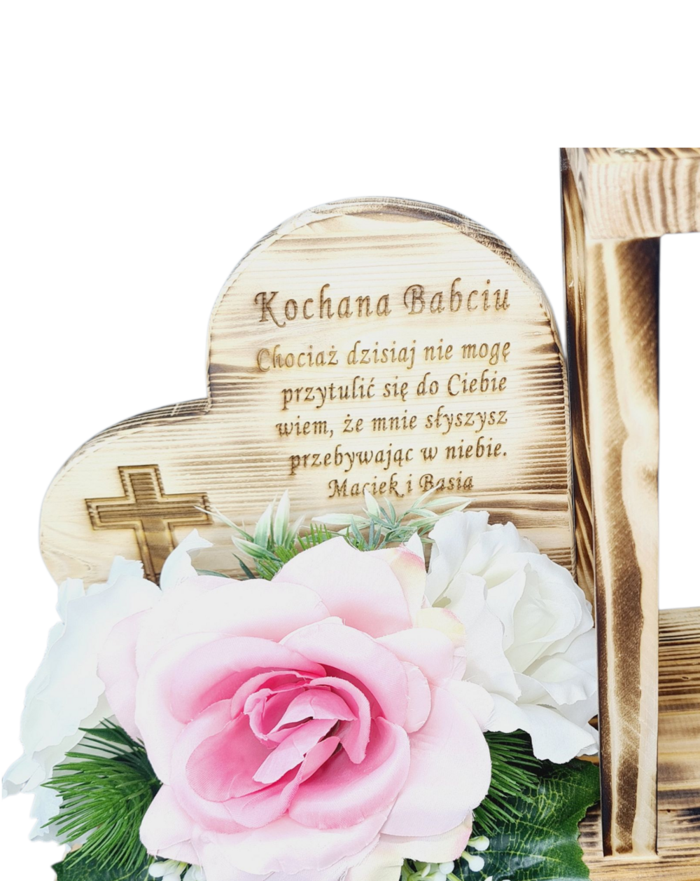Drewniany stroik nagrobny z opalanym lampionem i sercem z wierszem. Ozdobiony beżowymi różami z różowym lub bordowym akcentem. Subtelna, naturalna dekoracja pełna ciepła i wspomnień.