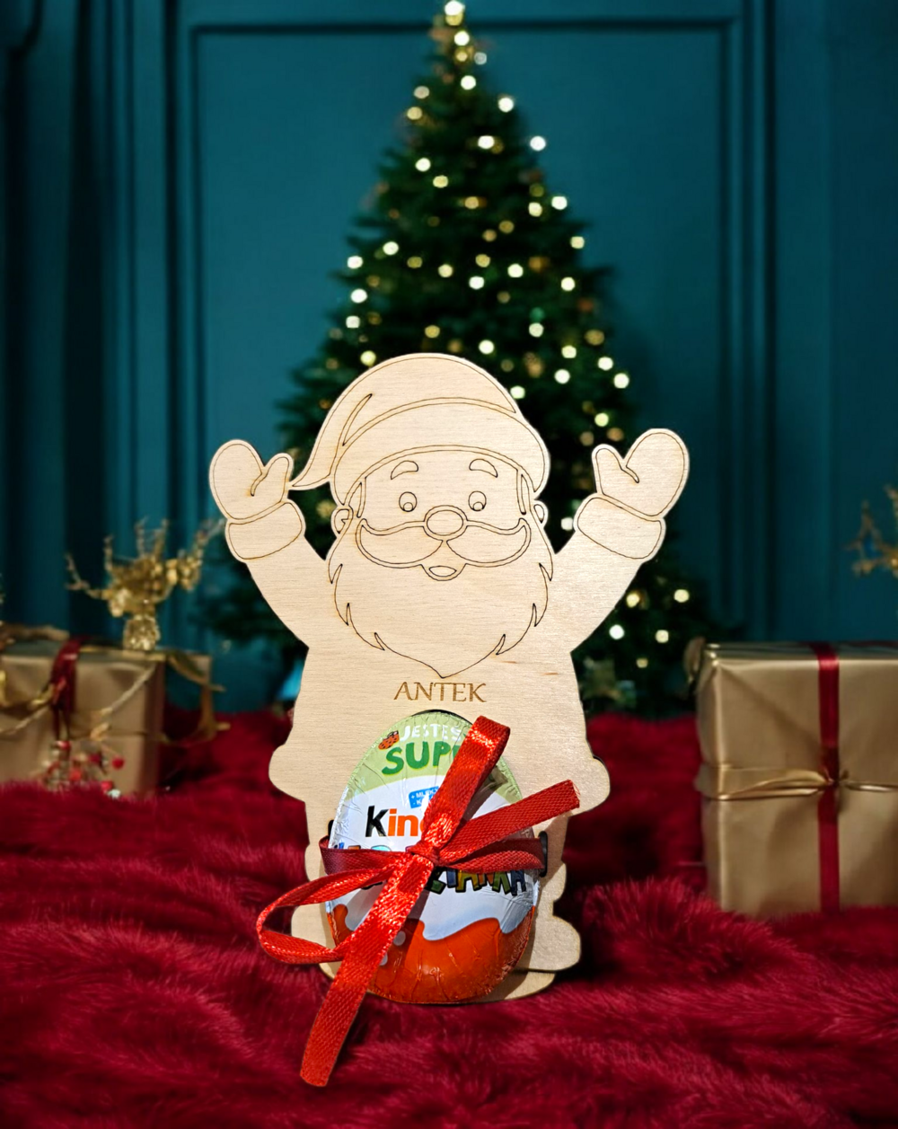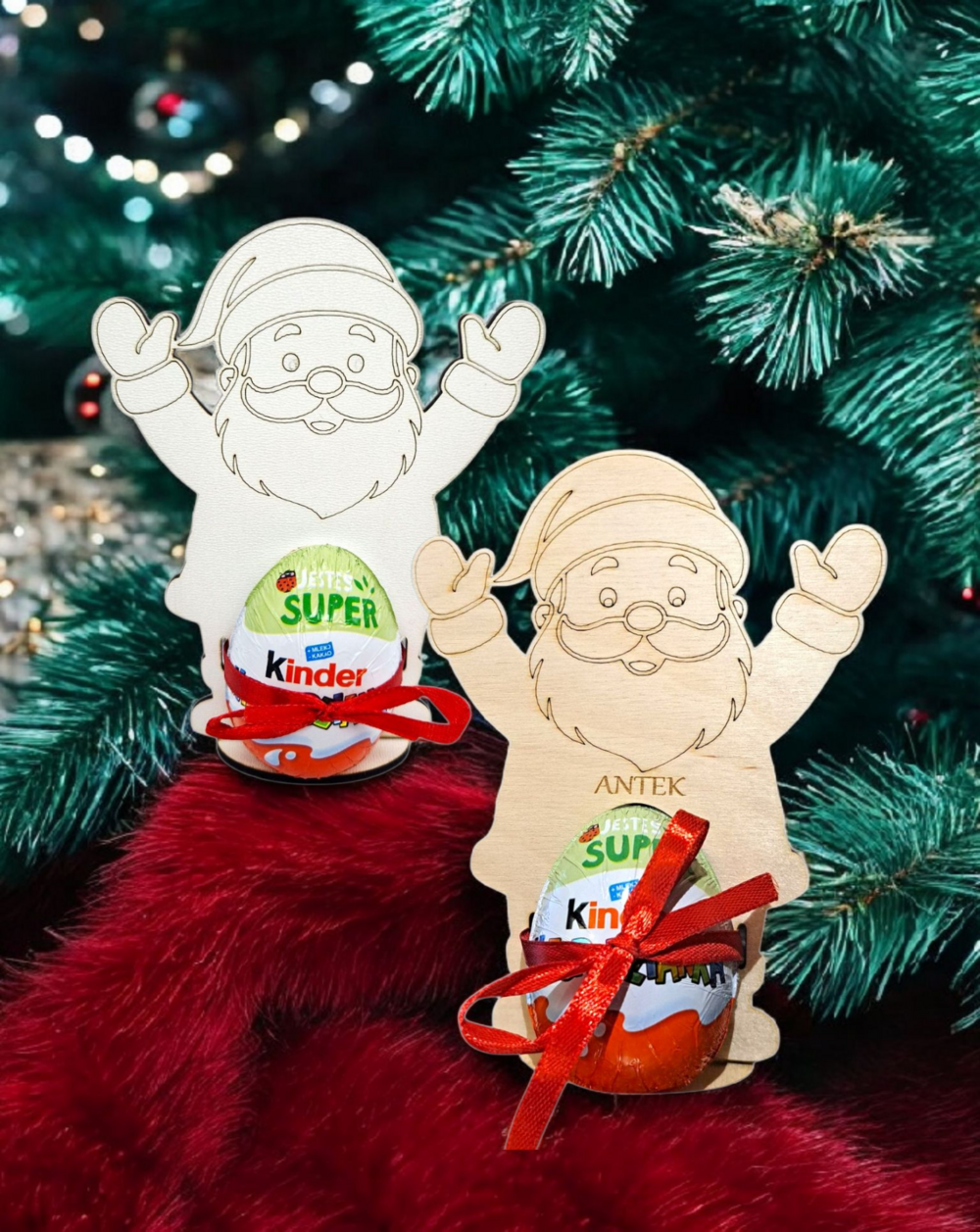 Świąteczny stojak na Kinder Jajko w kształcie Świętego Mikołaja to wyjątkowa dekoracja, która zachwyci zarówno dzieci, jak i dorosłych. Wykonany z wysokiej jakości drewnianej sklejki lub białej płyty HDF, doskonale sprawdzi się jako element prezentu, ozdoba stołu lub oryginalny upominek na Mikołajki.