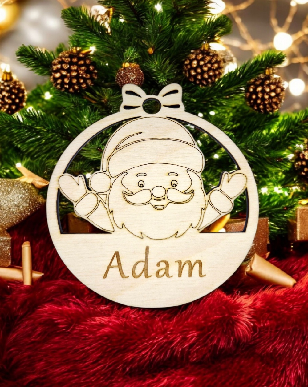 Drewniana bombka personalizowana z imieniem, wykonana z wysokiej jakości sklejki. W środku laserowo wycięty wzór Świętego Mikołaja. Idealna jako upominek dla dzieci i grup przedszkolnych — można ją samodzielnie pomalować i zawiesić na choince.