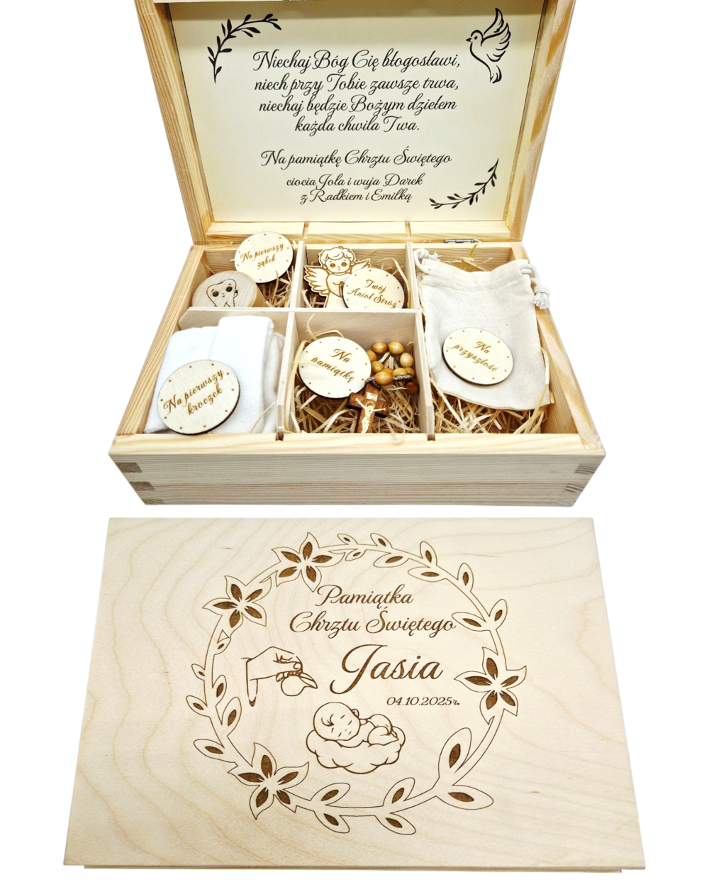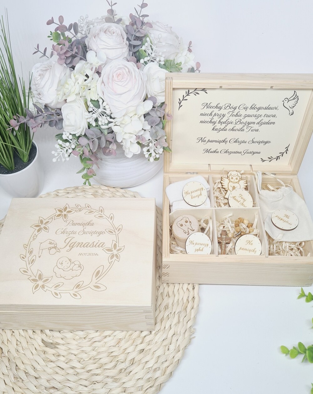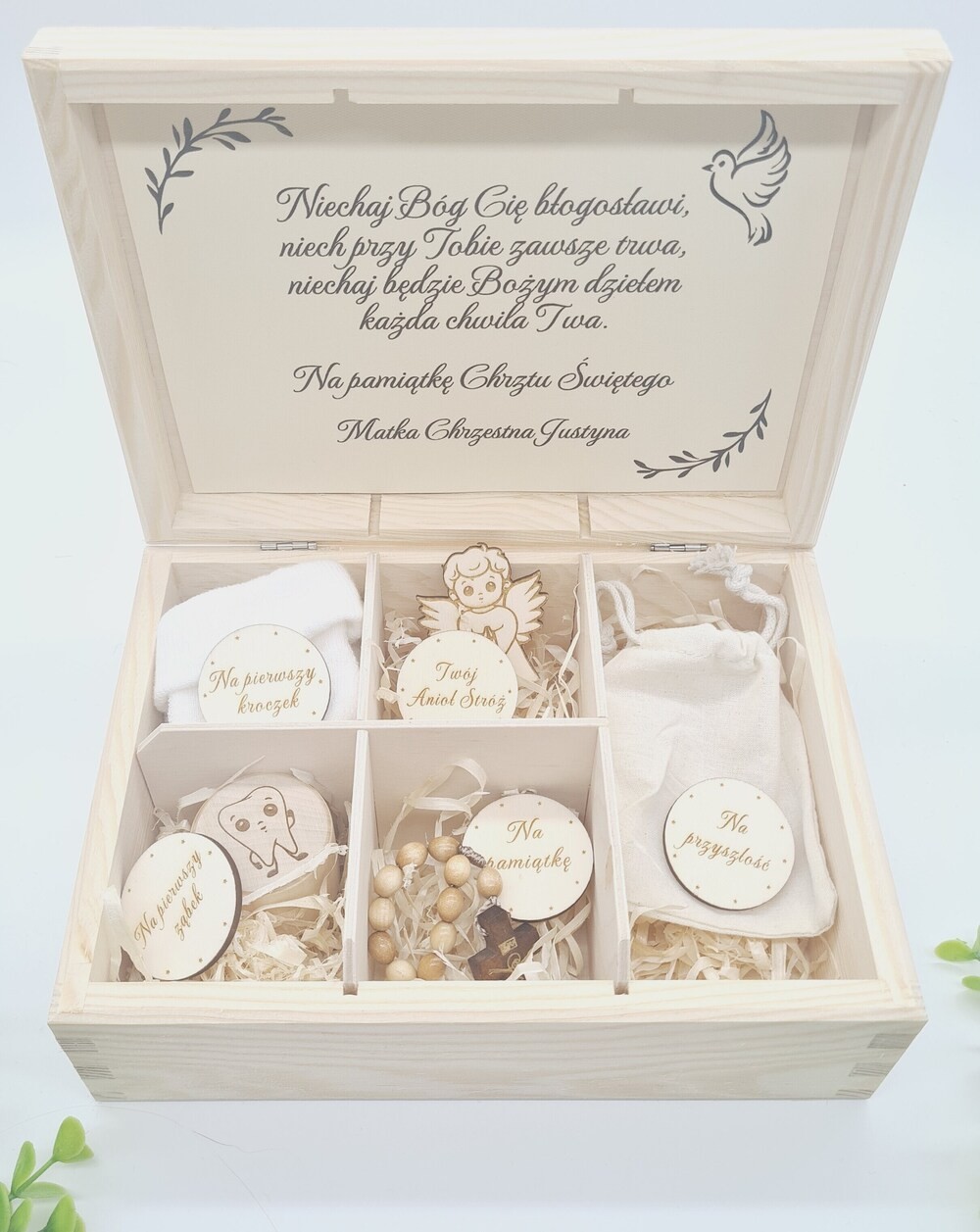 Nie zapomnij zapisać swojej personalizacji, aby móc dodać ją do koszykaNasza drewniana skrzyneczka z personalizowanym grawerem to idealny wybór na Pamiątkę Chrztu Świętego. Wykonana z wysokiej jakości drewna sprawia, że jej wygląd jest estetyczny oraz naturalny. Personalizacja dodatkowo powoduje, unikalność i dostosowania do konkretnej osoby. Przegródki wzbogacone o drobne upominki oraz kółeczka z podpisami wypełniają całość.