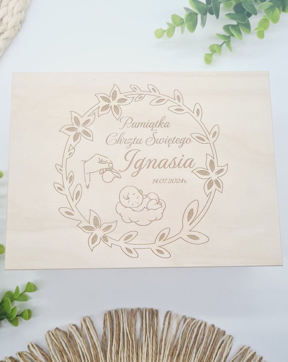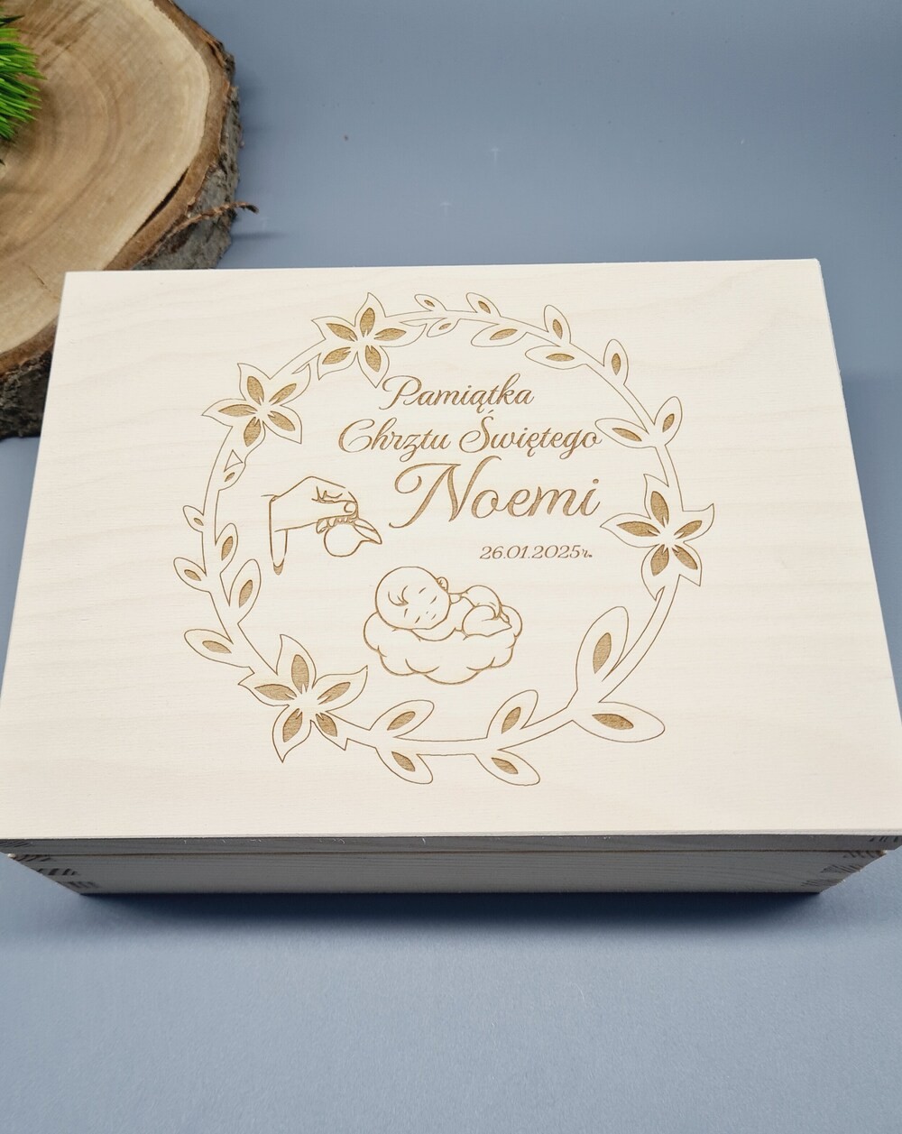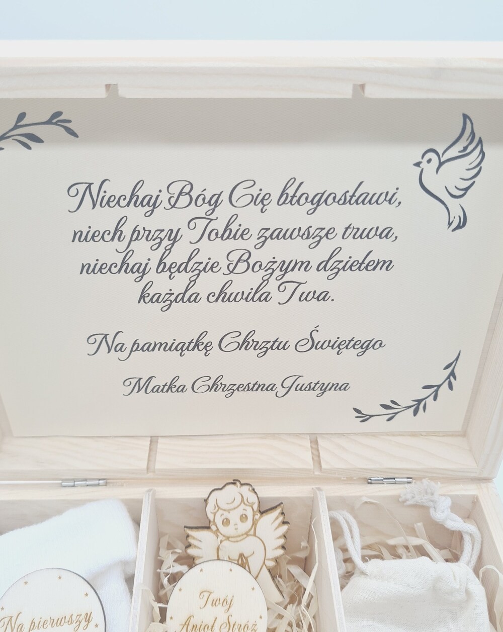 Nie zapomnij zapisać swojej personalizacji, aby móc dodać ją do koszykaNasza drewniana skrzyneczka z personalizowanym grawerem to idealny wybór na Pamiątkę Chrztu Świętego. Wykonana z wysokiej jakości drewna sprawia, że jej wygląd jest estetyczny oraz naturalny. Personalizacja dodatkowo powoduje, unikalność i dostosowania do konkretnej osoby. Przegródki wzbogacone o drobne upominki oraz kółeczka z podpisami wypełniają całość.