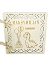 Na przedniej stronie znajduje się precyzyjny grawer z imieniem dziecka, jego wiekiem oraz uroczym motywem dinozaura, prezentów i balonów. Całość dopełnia piękny ażurowy wzór wycięty laserowo, który dodaje lekkości i wyjątkowego efektu wizualnego.