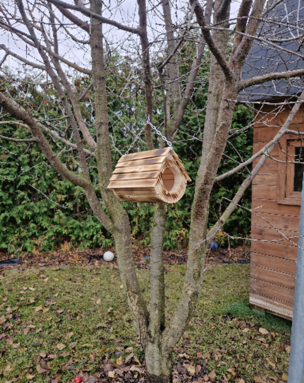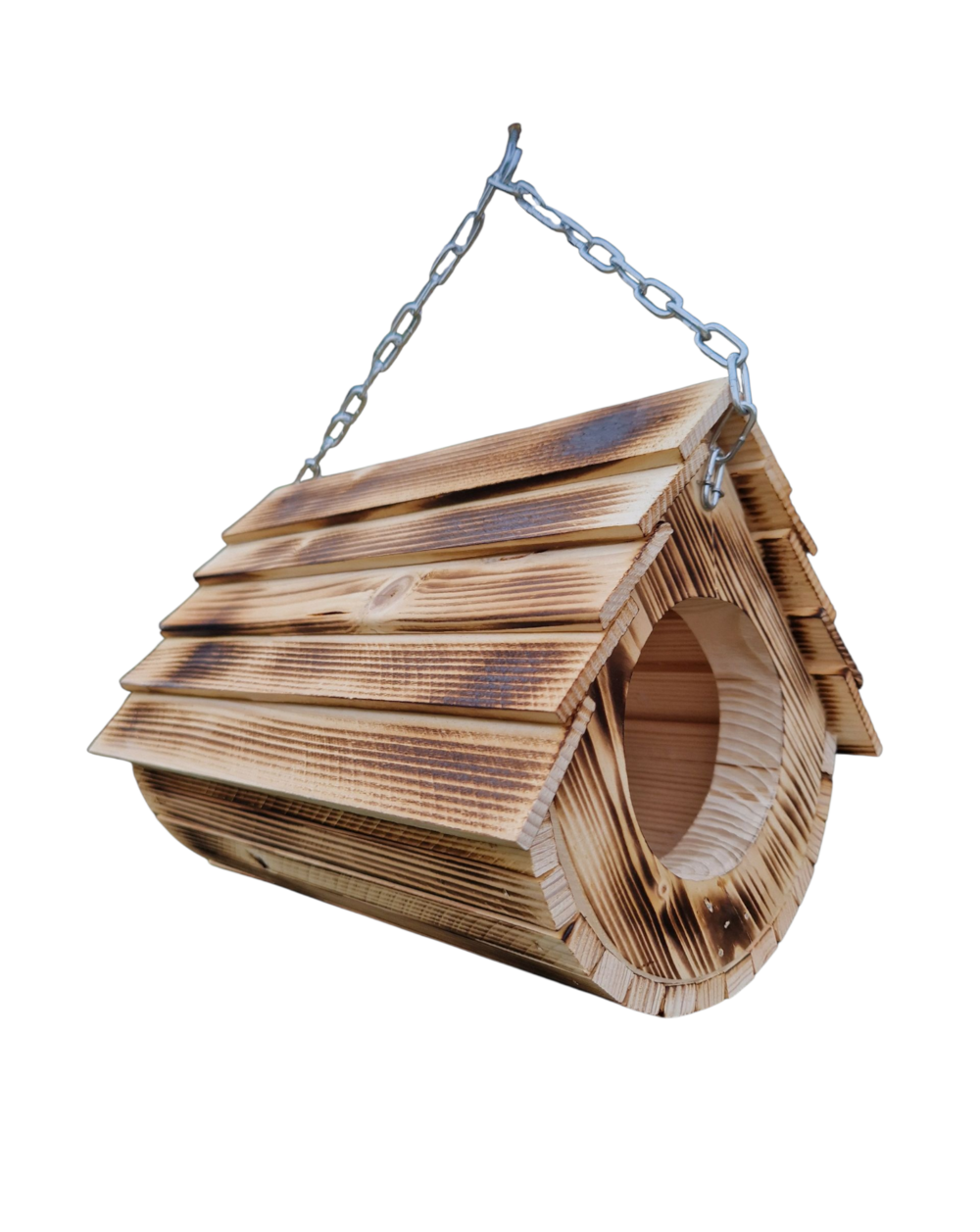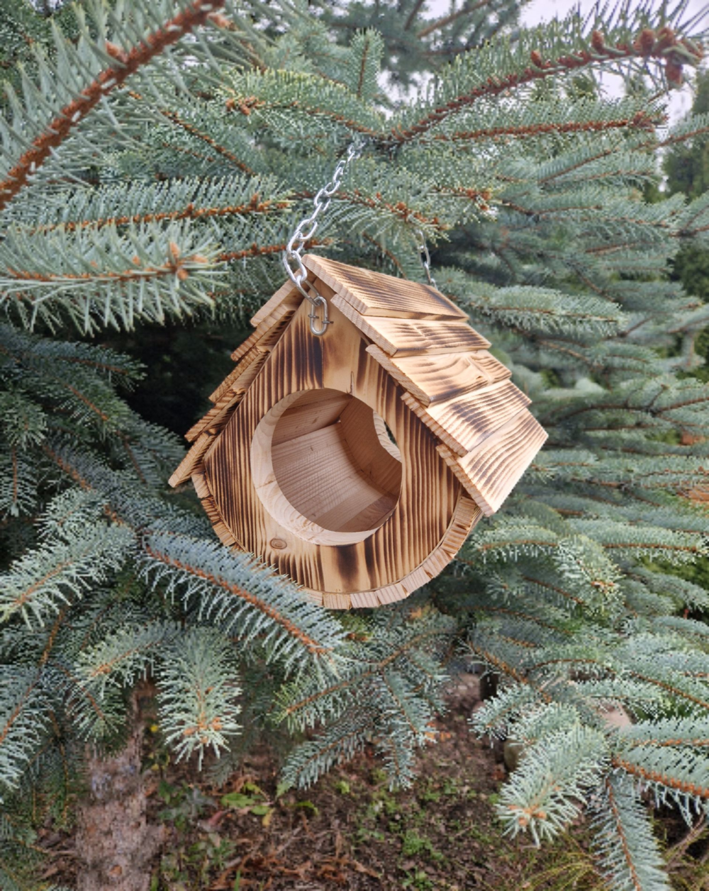 Solidny, ręcznie wykonany karmnik dla ptaków z naturalnego drewna, wykończony w technice opalania, która podkreśla piękno słojów i nadaje rustykalny styl. Idealny do ogrodu, na balkon i działkę. Stabilna konstrukcja, otwarta przestrzeń ułatwiająca pobieranie karmy, a w zestawie łańcuch do zawieszenia. Każdy egzemplarz jest unikatowy dzięki ręcznemu wykonaniu i naturalnemu drewnu.