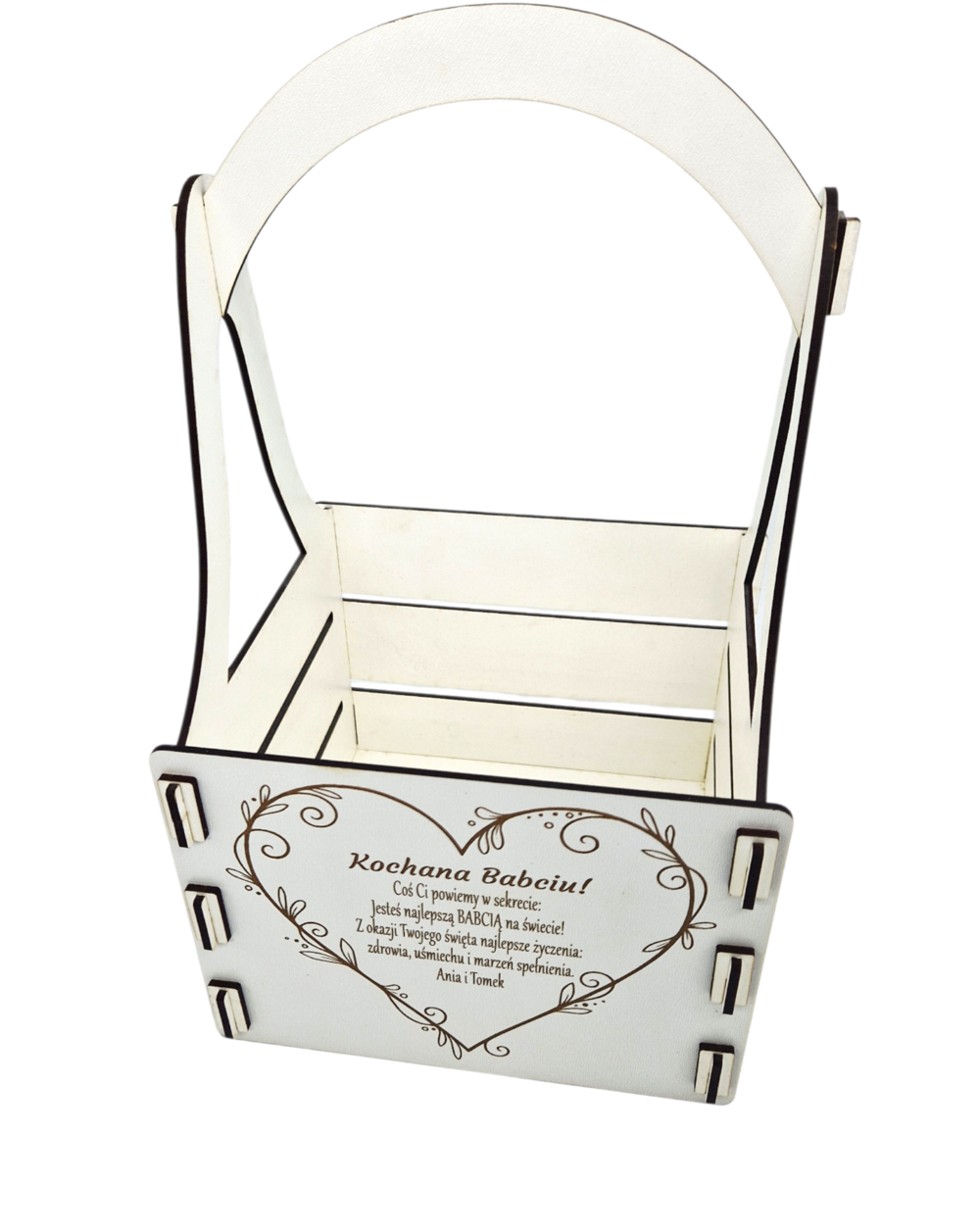 Nie zapomnij zapisać swojej personalizacji, aby móc dodać ją do koszykaStylowa biała skrzynka wykonana z wysokiej jakości płyty HDF to wyjątkowa propozycja na elegancki i personalizowany prezent. Doskonale sprawdzi się jako opakowanie na kwiaty, słodycze lub drobne upominki, nadając im niepowtarzalny charakter.
