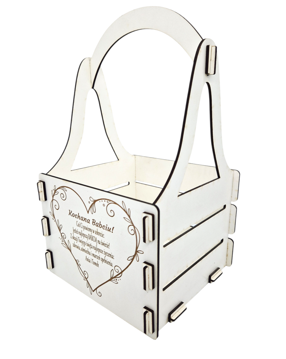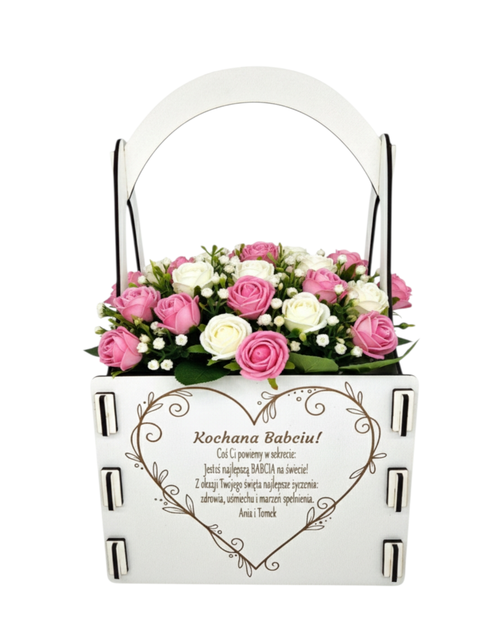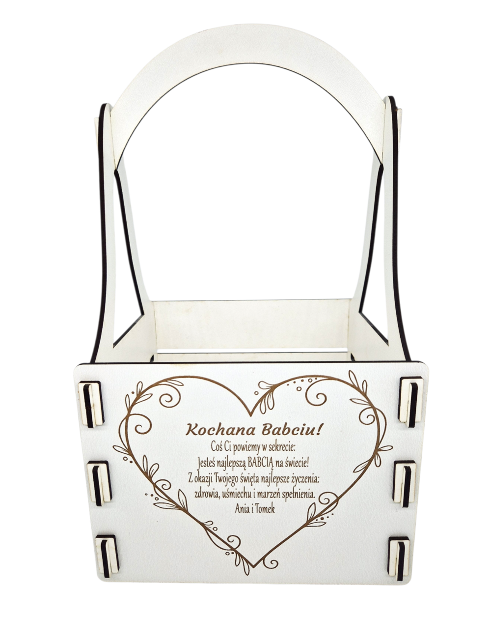 Uwaga: Elementy widoczne na zdjęciach, takie jak kwiaty, słodycze czy inne dekoracje, pełnią jedynie funkcję poglądową i nie są przedmiotem sprzedaży. Cena produktu obejmuje wyłącznie samą skrzynkę z personalizowanym grawerem.