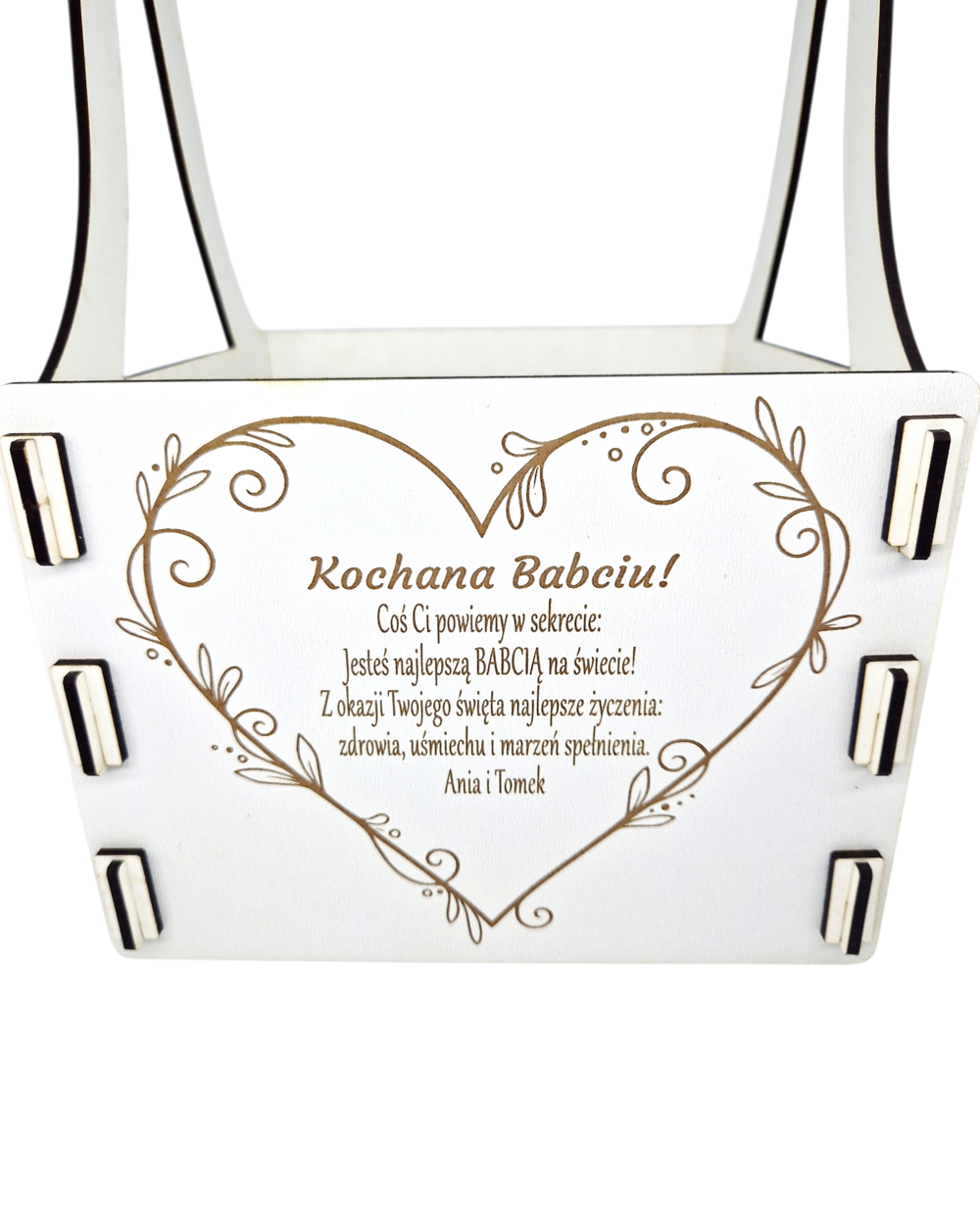 Prezentowane zdjęcie pokazuje przykładowy grawer dedykowany dla dziadków, jednak podczas składania zamówienia — wpisując treść w odpowiednie rubryki personalizacji — możesz łatwo zmienić grawer, np. dla samej babci, dla samego dziadka lub innej osoby.