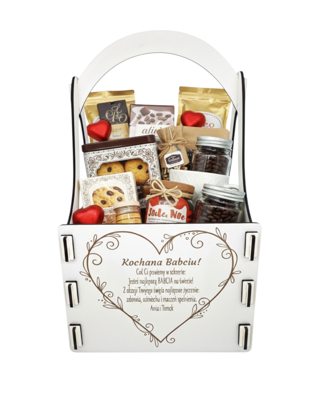 Skrzynka posiada personalizowany grawer umieszczony na przedniej stronie, zawierający życzenia oraz podpis – od kogo jest prezent. Dzięki temu każdy egzemplarz może być dopasowany do konkretnej okazji i osoby obdarowanej.