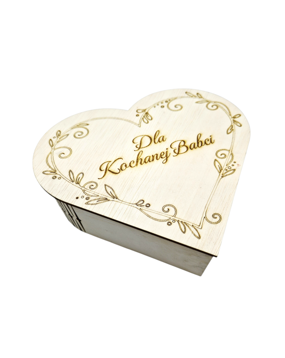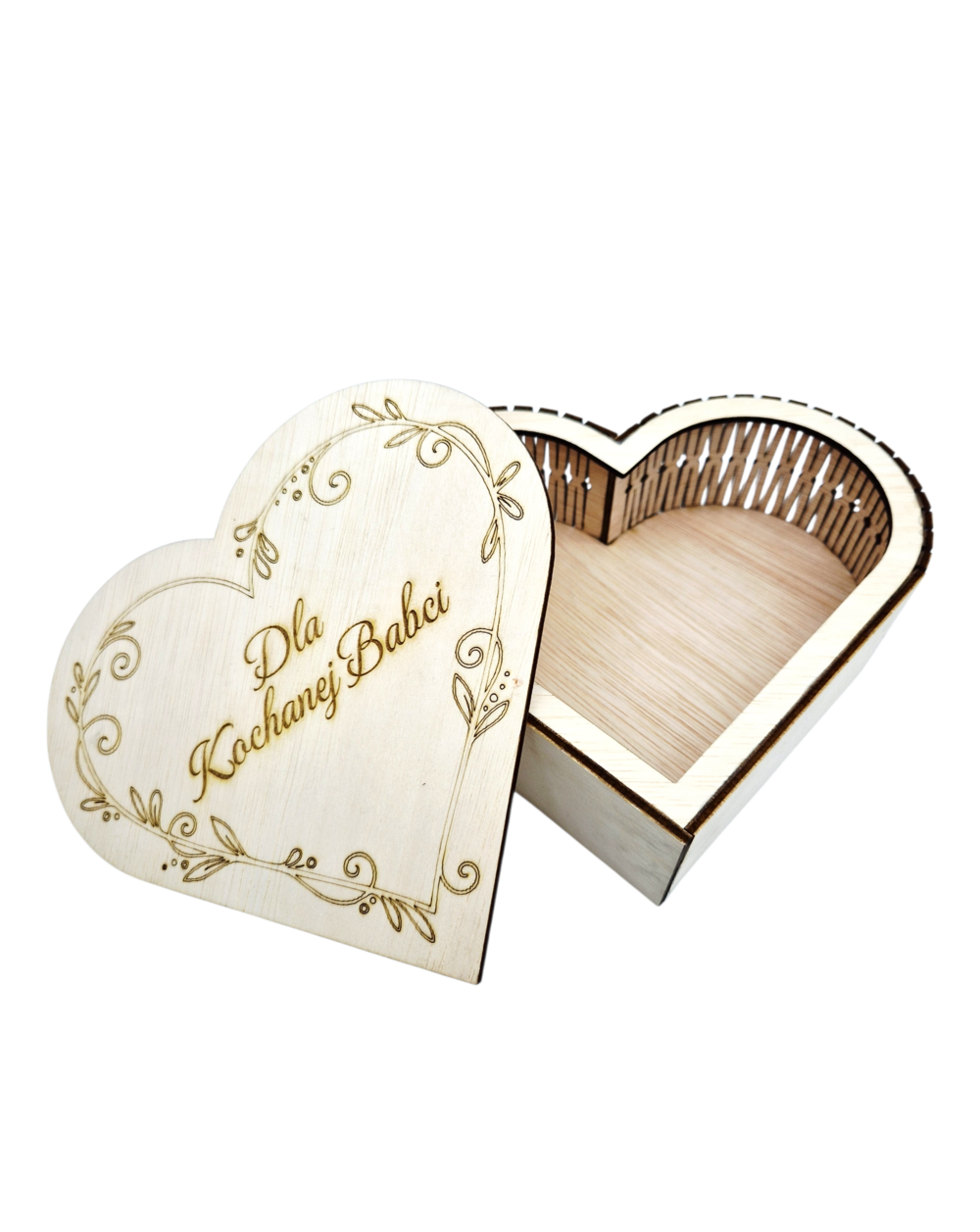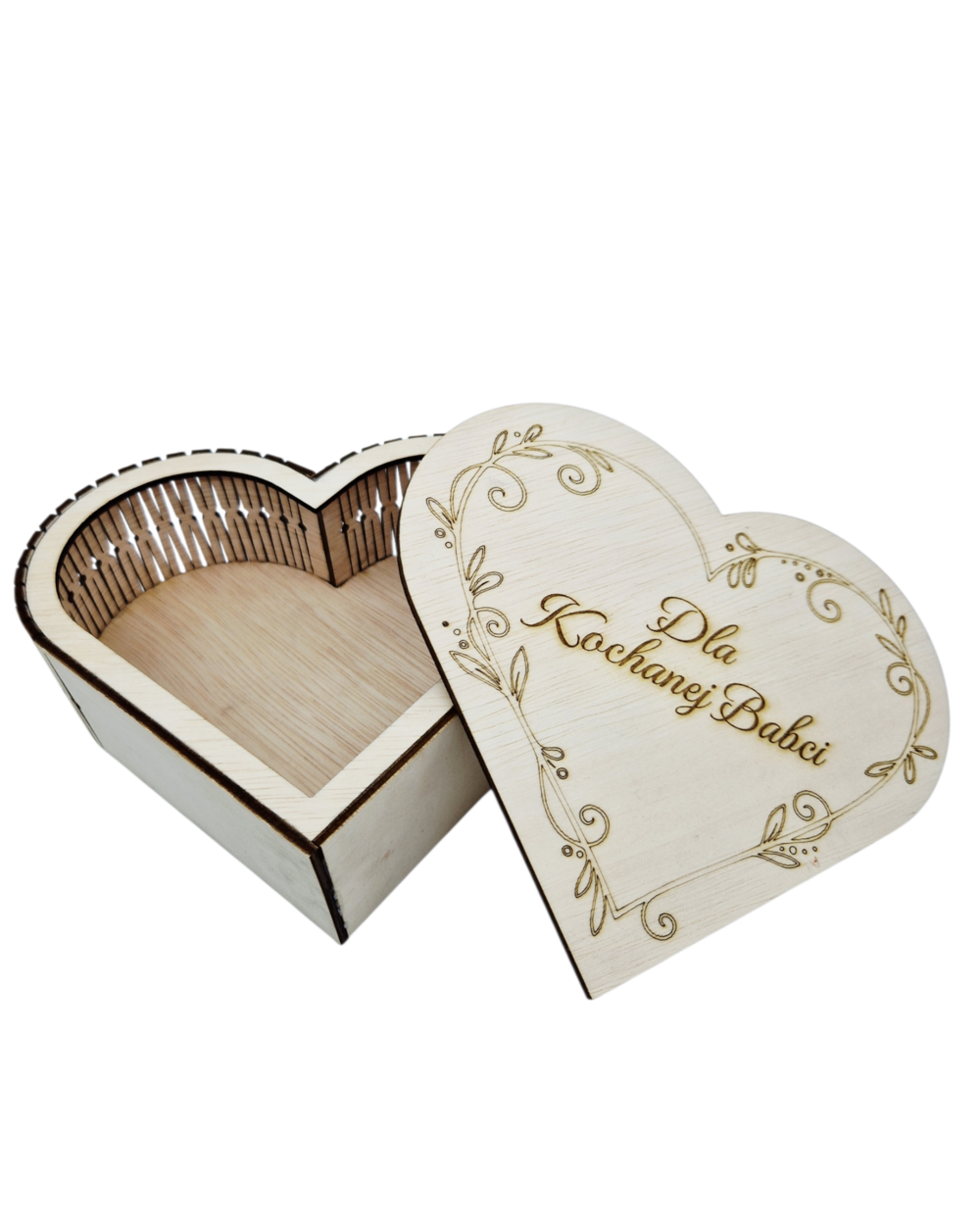 Eleganckie drewniane pudełko w kształcie serca wykonane z naturalnej sklejki. Idealne na drobiazgi, pamiątki lub prezent. Możliwość personalizacji graweru – dla babci, dziadka, mamy lub innej bliskiej osoby. Wymiary wewnętrzne ok. 15 × 15 cm (w najdłuższym miejscu).