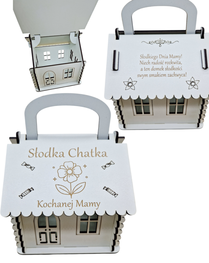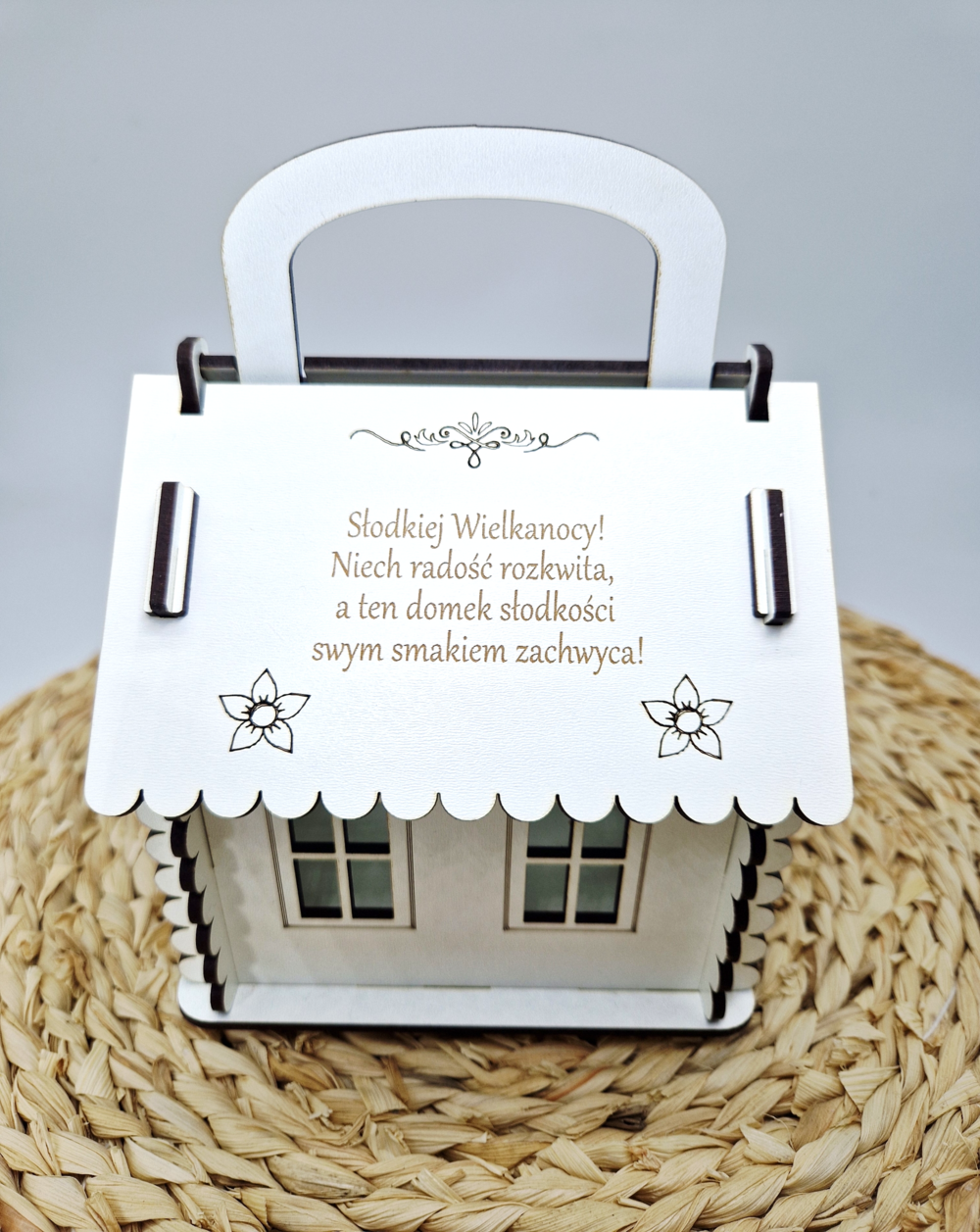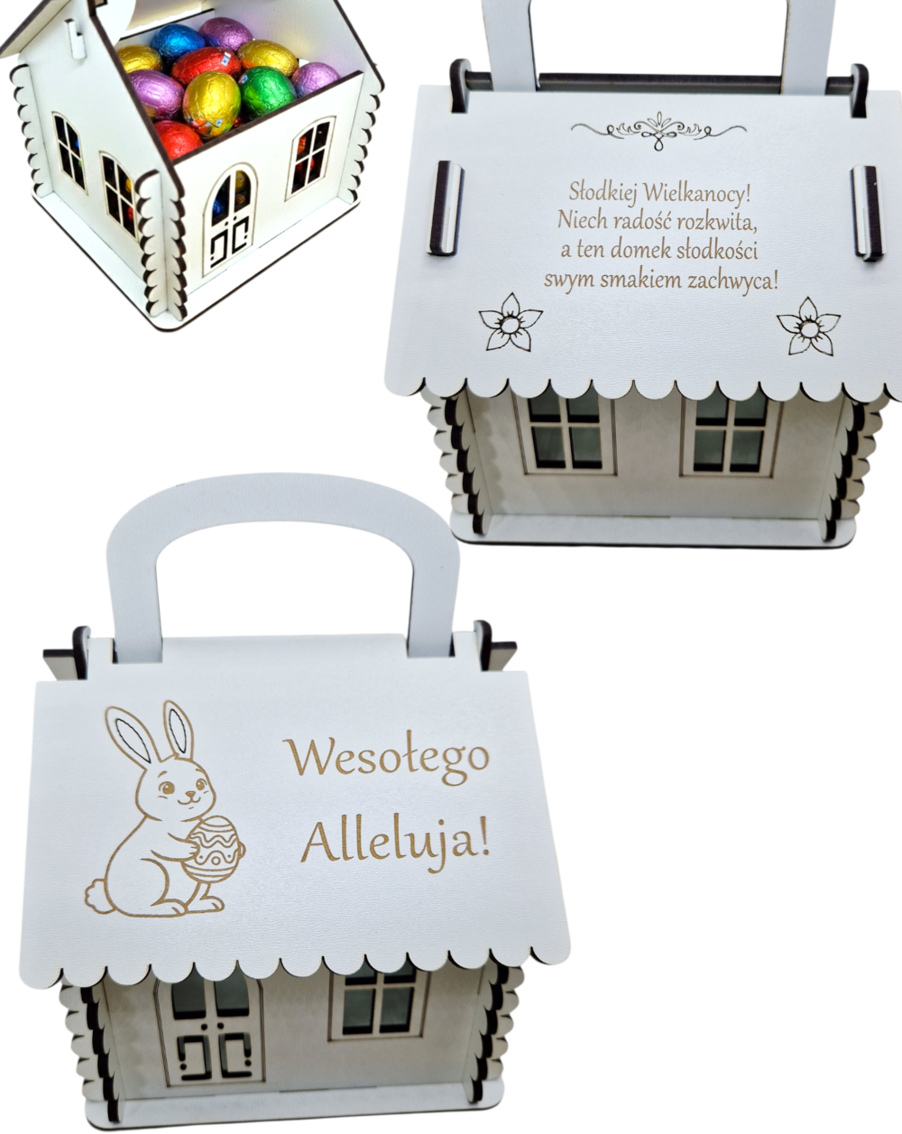 Domek ma klasyczny kształt z okienkami i drzwiczkami, a jego dach zdobią wielkanocne motywy – napis „Wesołego Alleluja!”, zajączek oraz subtelne ornamenty. Dodatkowym atutem jest wygodna rączka, która ułatwia przenoszenie i sprawia, że domek doskonale sprawdzi się jako prezent.
