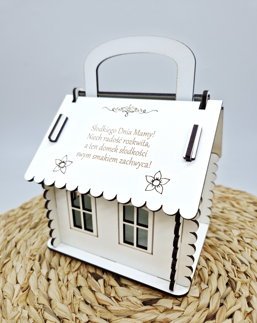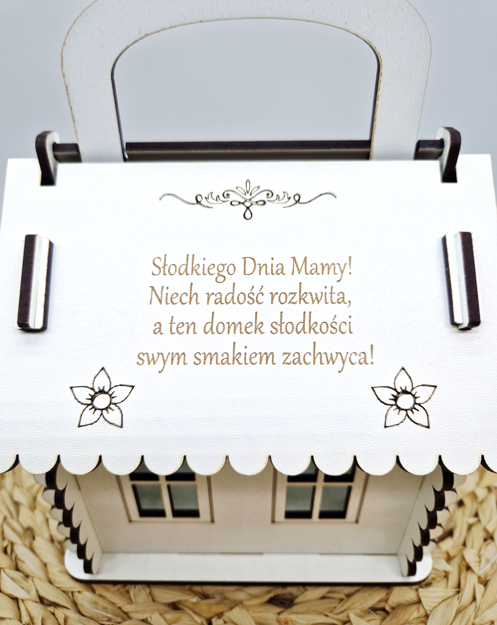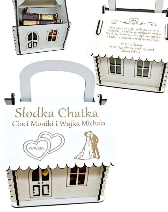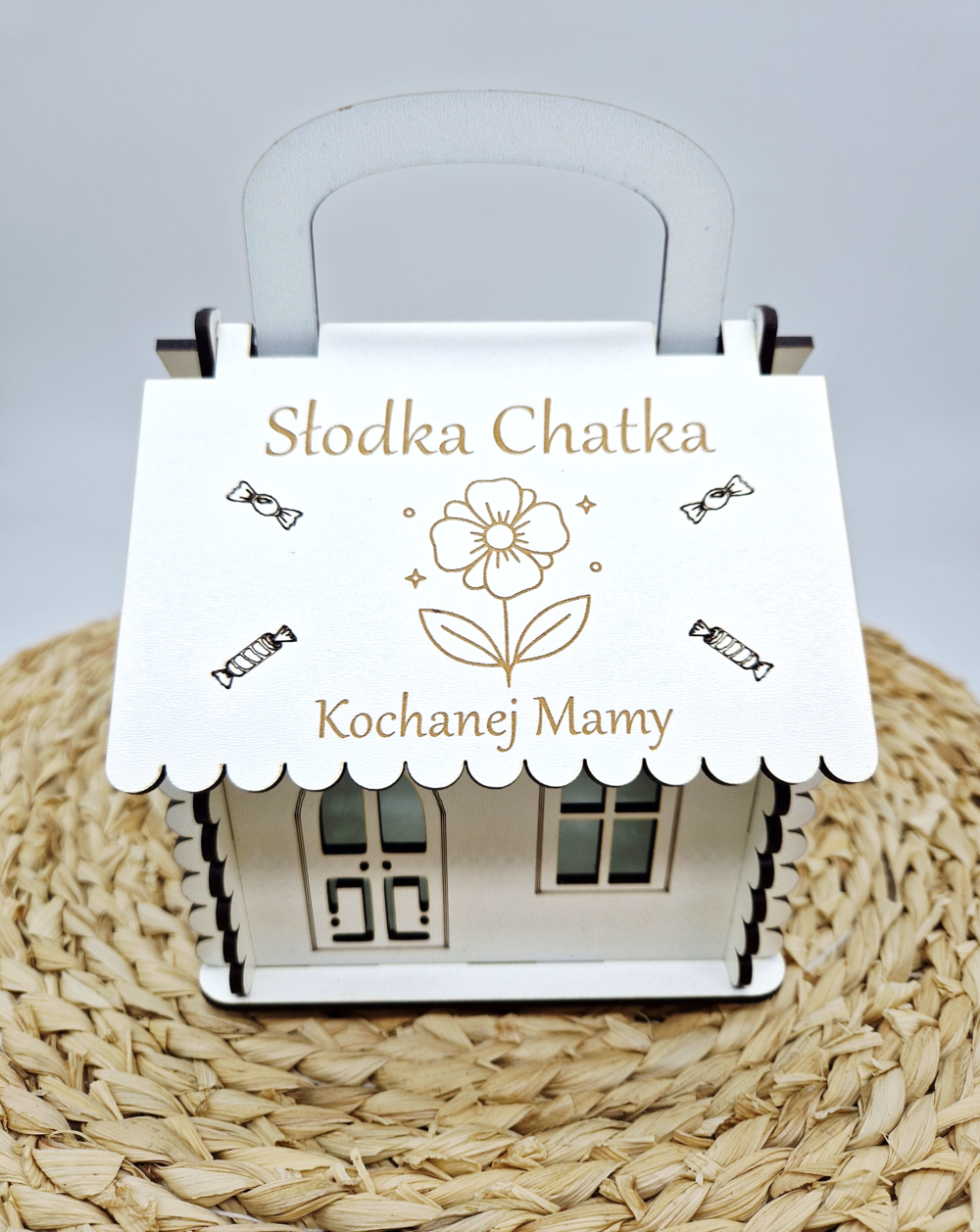 Słodka chatka z płyty HDF to wyjątkowy upominek dla Mamy. Ozdobne opakowanie na słodycze o wymiarach 18 × 13 × 13 cm, z możliwością personalizacji.