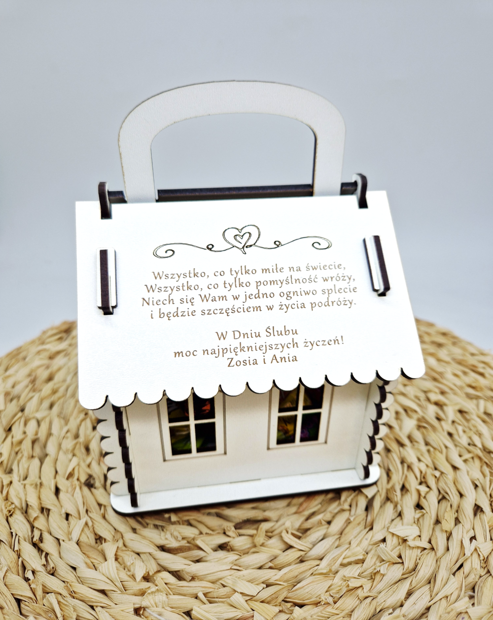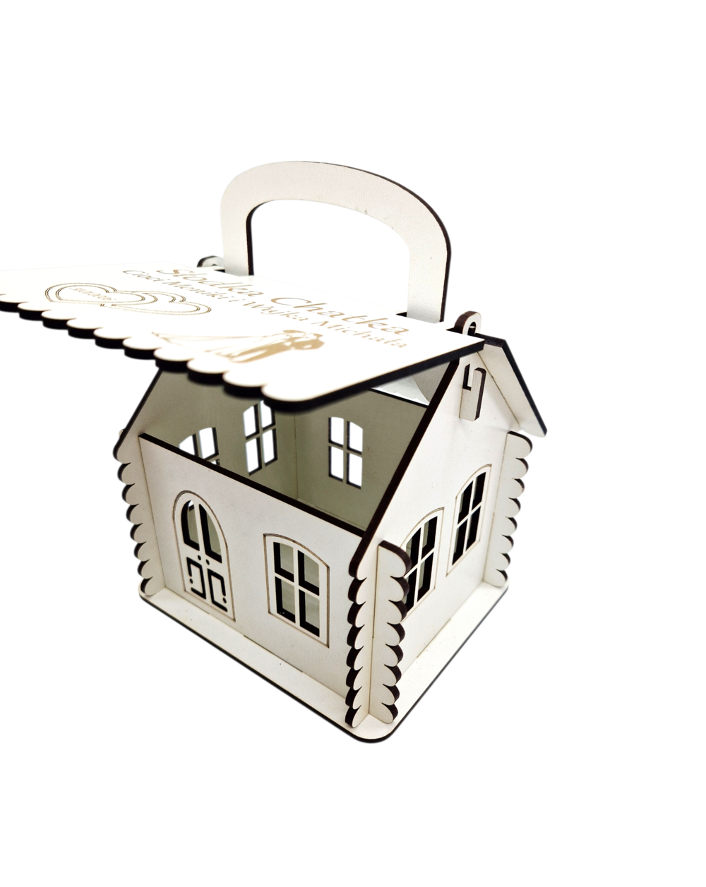 Chatka została wykonana z wysokiej jakości płyty HDF, co zapewnia estetyczne wykończenie, trwałość oraz stabilność konstrukcji. Klasyczny kształt domku z okienkami i drzwiczkami symbolizuje wspólny dom i nowy początek, a ozdobny dach z rączką ułatwia przenoszenie prezentu.