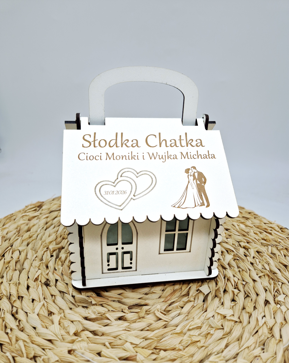 Na dachu znajduje się personalizowany grawer z napisem „Słodka Chatka”, imionami osób obdarowanych, datą ślubu oraz delikatnymi motywami serc i Pary Młodej. Istnieje możliwość pełnej personalizacji treści – dane do graweru należy wpisać w odpowiedniej rubryce dostosowania podczas składania zamówienia.