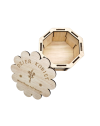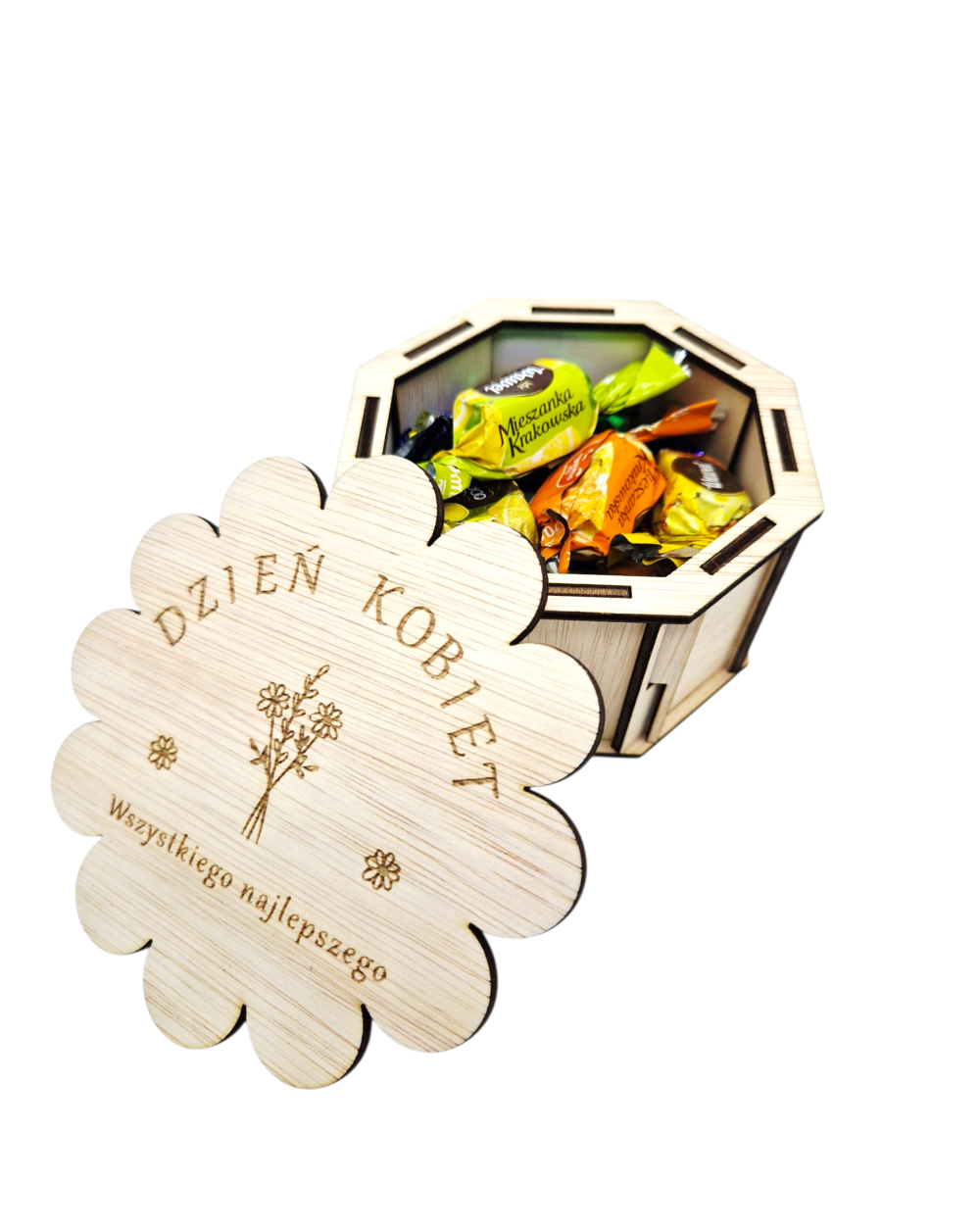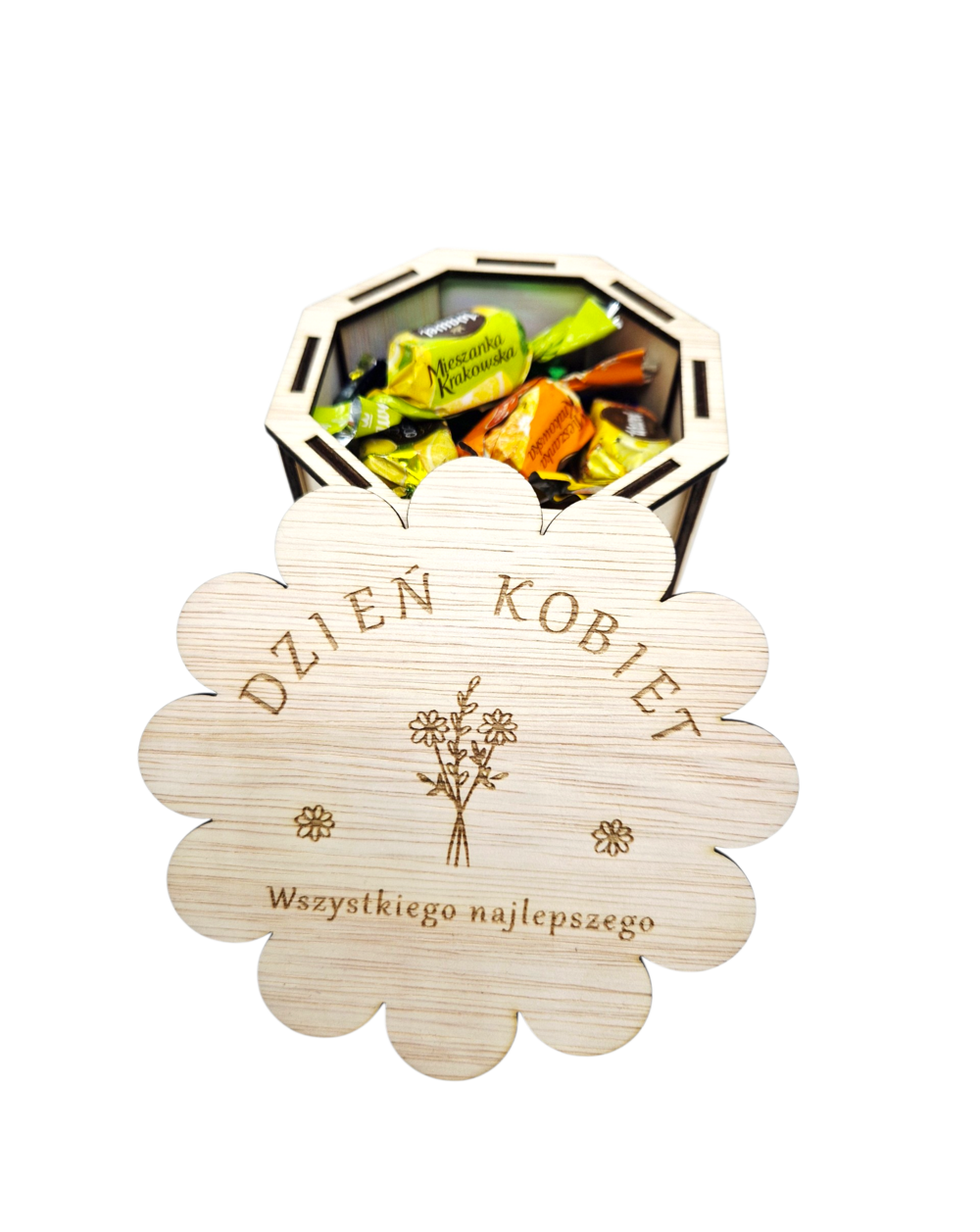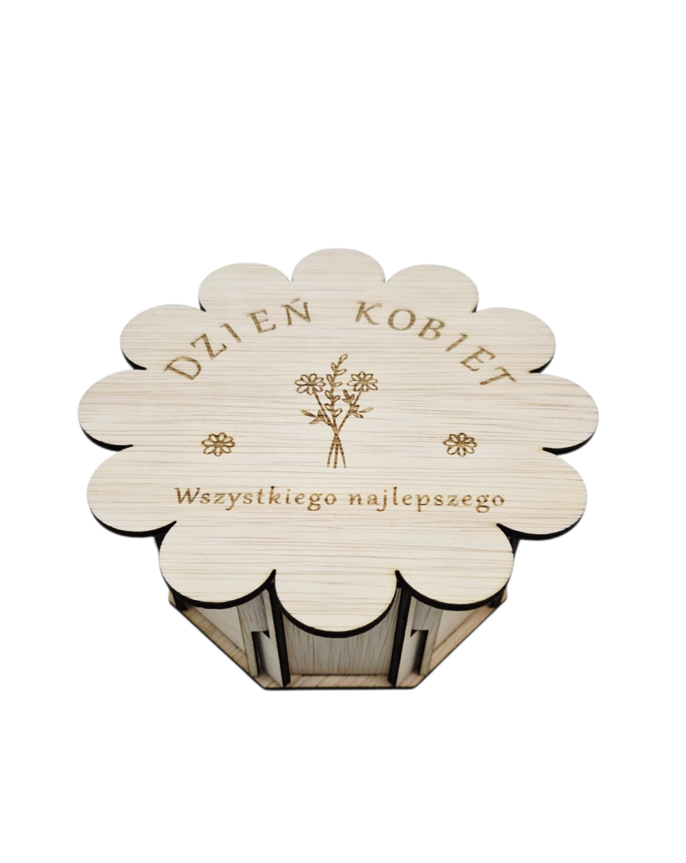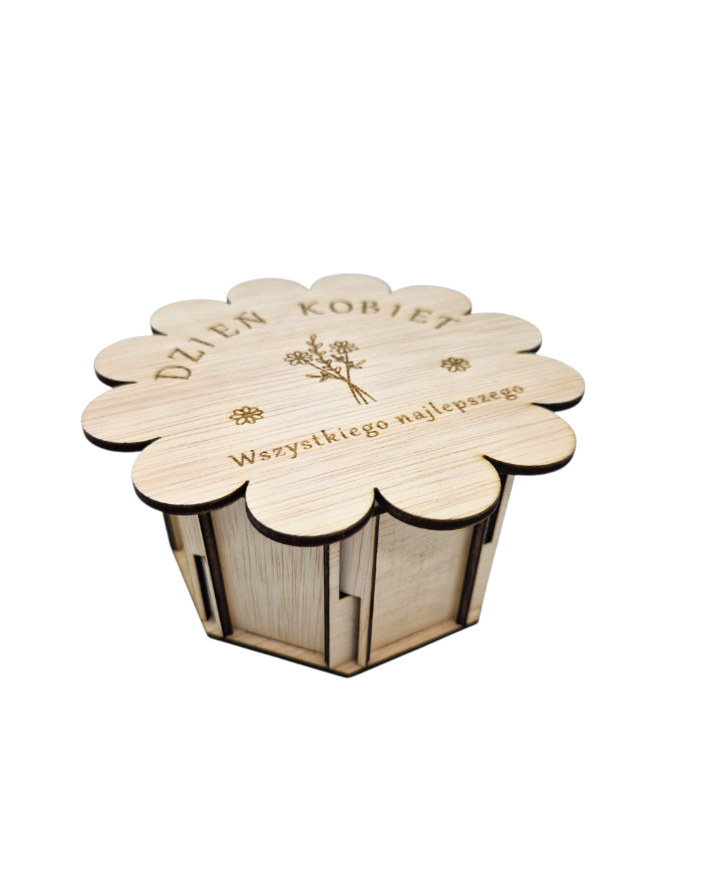 Drewniane pudełko prezentowe wykonane ze sklejki, idealne na cukierki lub drobne upominki. Pudełko o wymiarach 10×10 cm z ozdobnym wieczkiem w kształcie kwiatka (13×13 cm). Doskonałe jako eleganckie opakowanie prezentowe