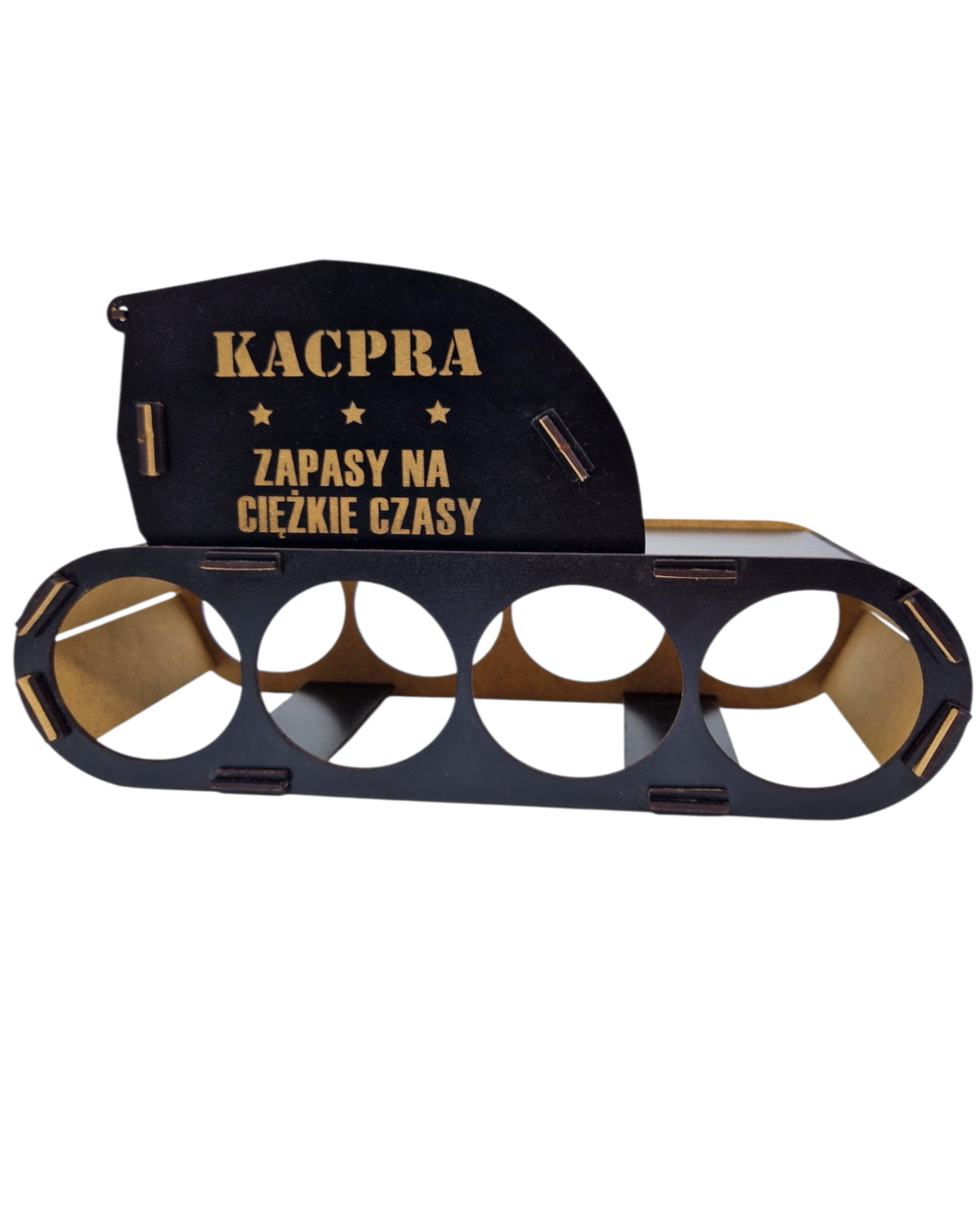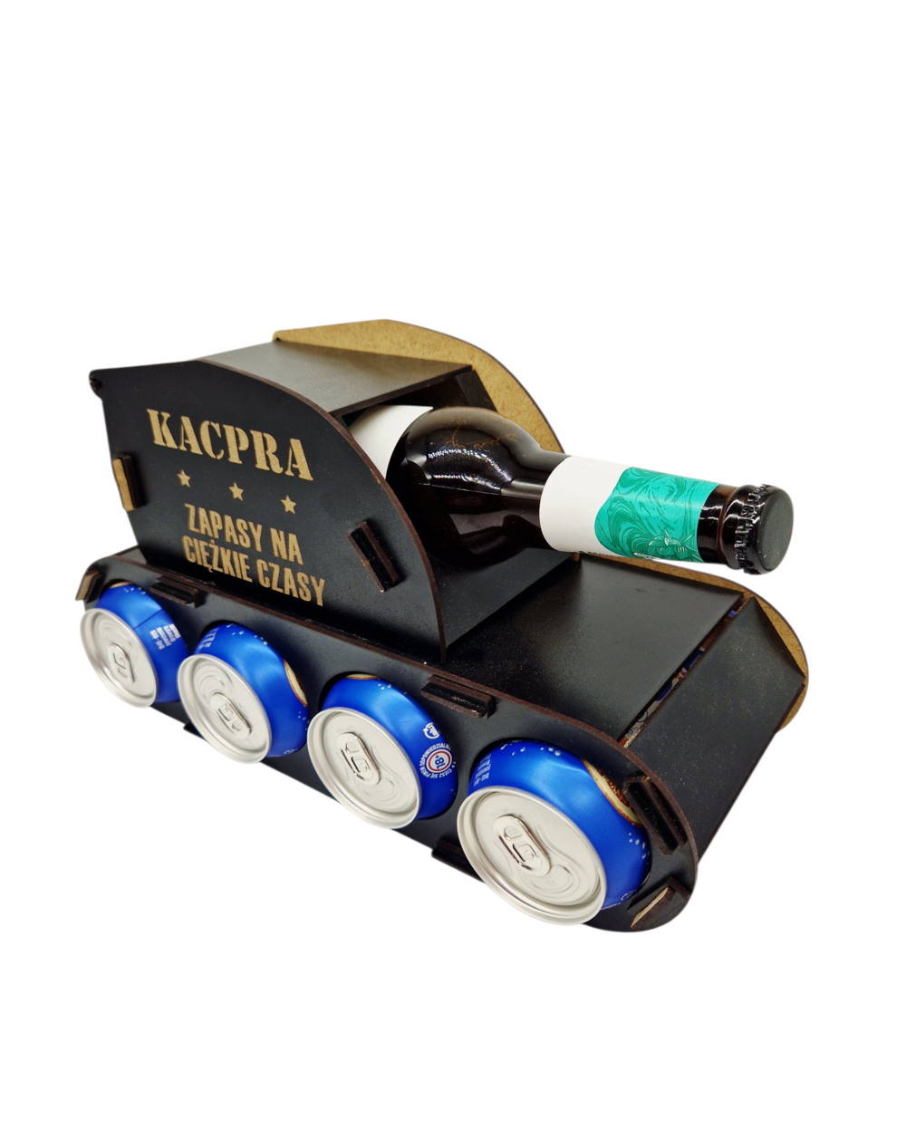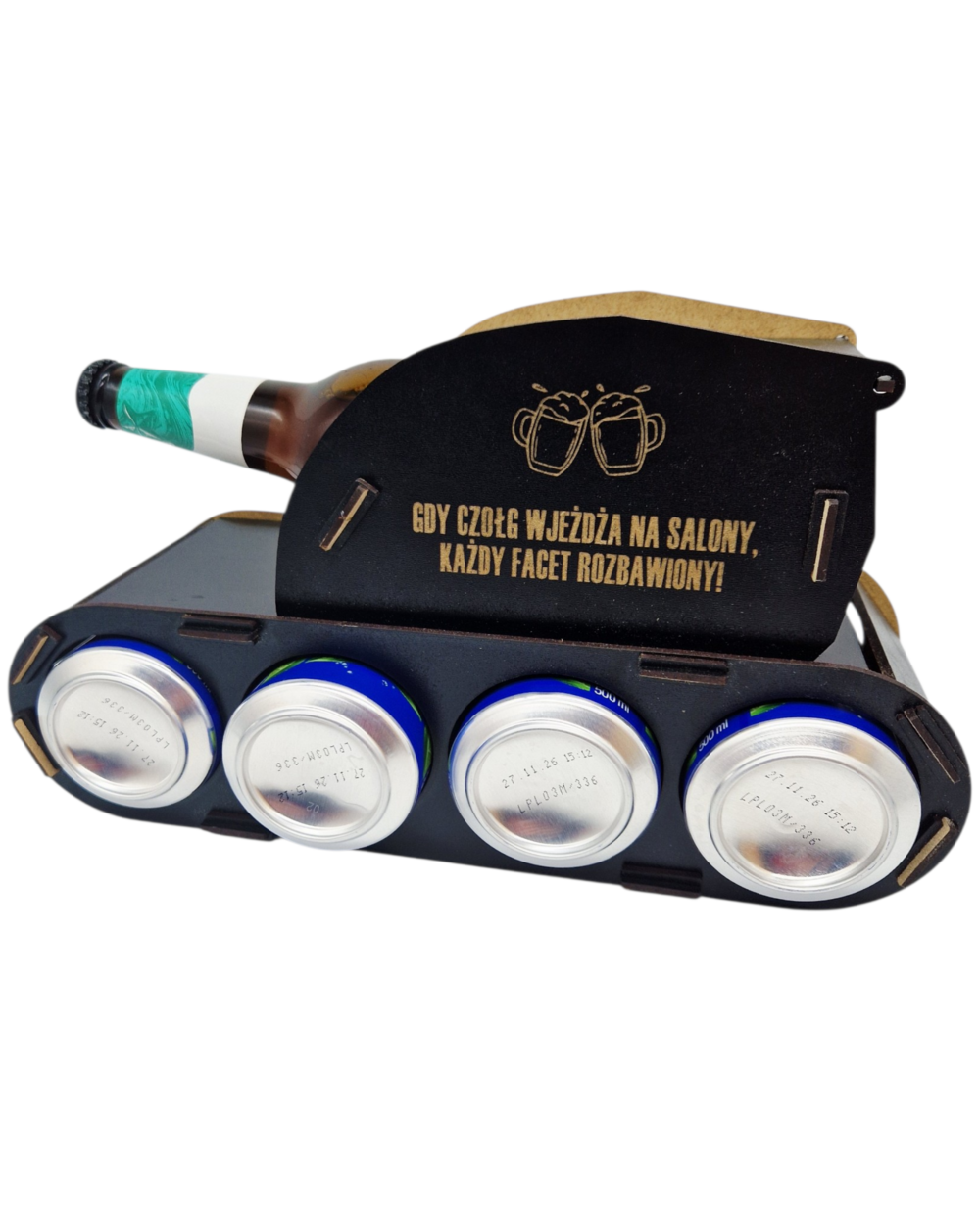 Czołg został wykonany z trwałej i estetycznej płyty HDF, co zapewnia stabilność oraz solidne wykończenie. Konstrukcja pozwala na umieszczenie 4 puszek oraz 1 butelki, dzięki czemu całość prezentuje się efektownie i praktycznie. Grawerowane napisy dodają humoru i sprawiają, że produkt wyróżnia się na tle klasycznych nosidełek.
