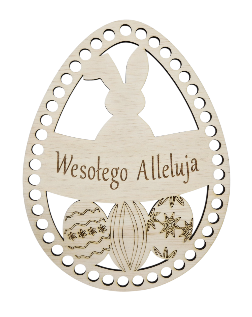 Ażurowa baza do makramy w kształcie jajka, zdobiona grawerem „Wesołego Alleluja”, sylwetką zająca oraz detalami pisanek. Wykonana z wysokiej jakości sklejki o wymiarach 19,6 x 14,7 cm. Idealna do tworzenia świątecznych stroików, makramowych zawieszek na drzwi i prezentów DIY. Klasyczny, rustykalny styl, który zachwyci Twoich bliskich.