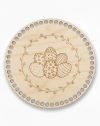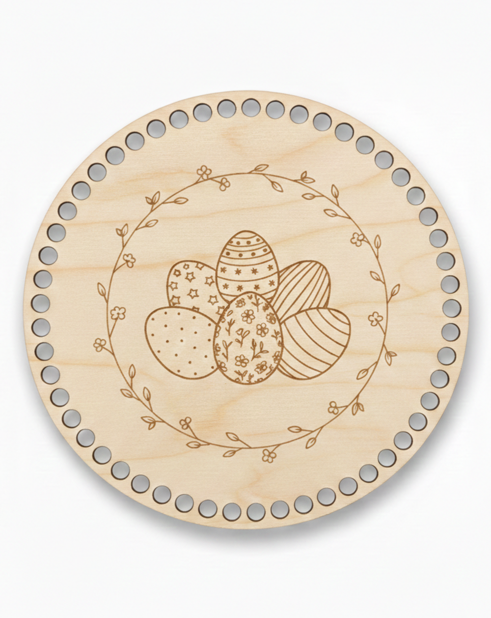 Solidna, okrągła baza o średnicy 19,5 cm wykonana z drewnianej sklejki. Idealna do szydełkowania koszyczków ze sznurka bawełnianego. Zdobiona precyzyjnym grawerem z motywem wielkanocnych pisanek w delikatnym wianuszku, który nada Twojemu rękodziełu świątecznego uroku.