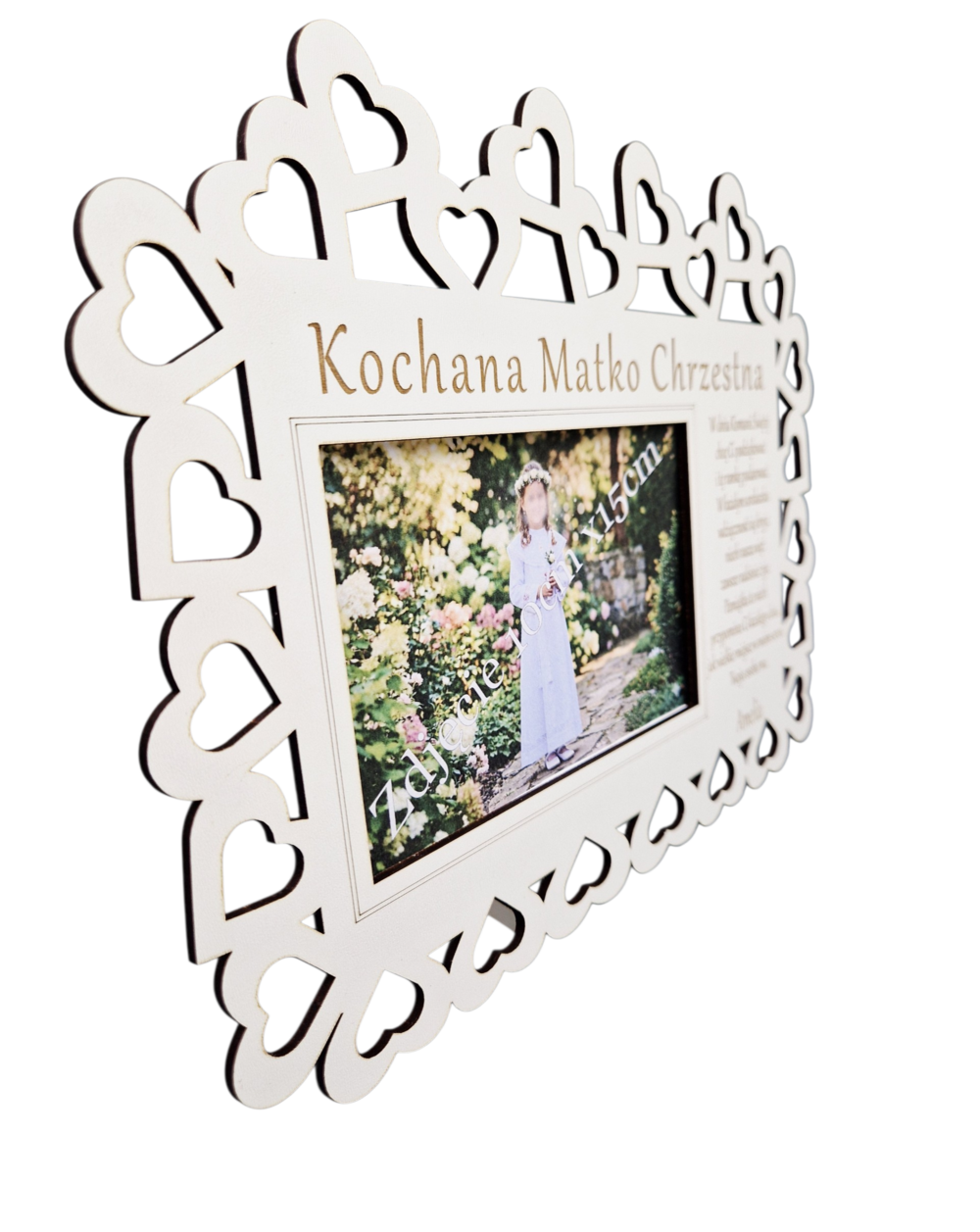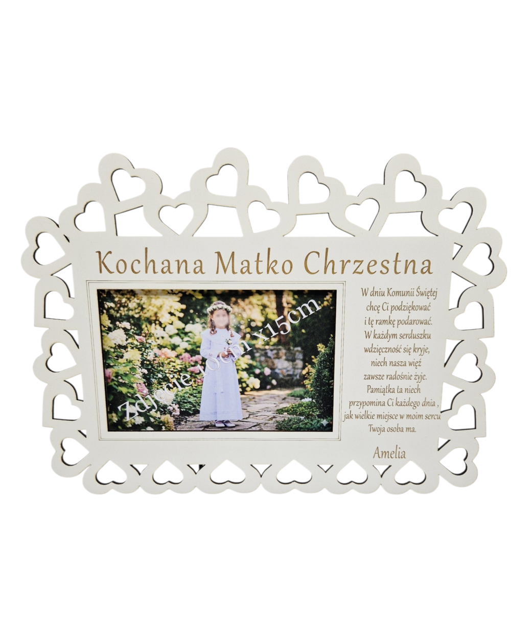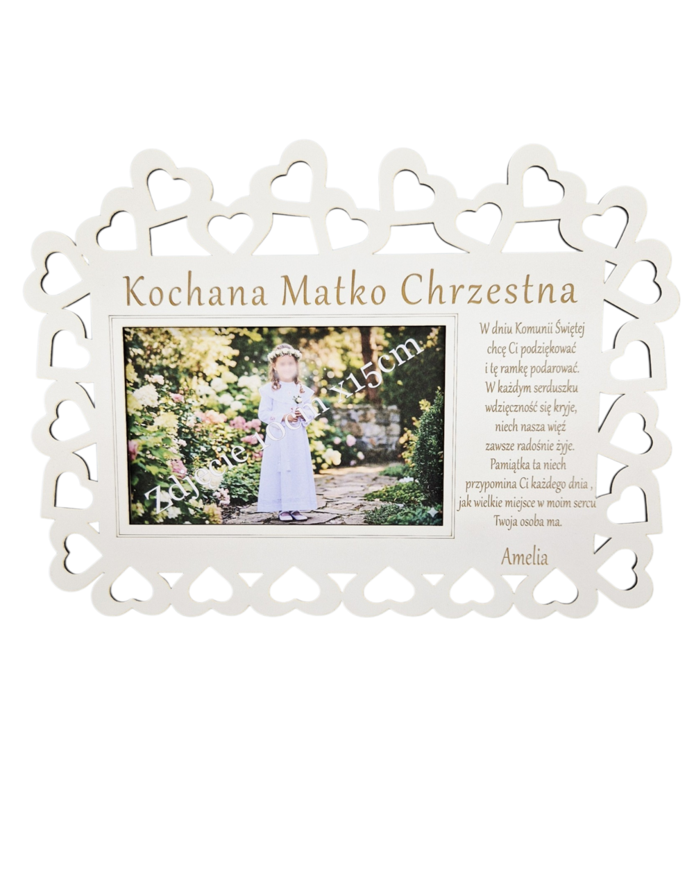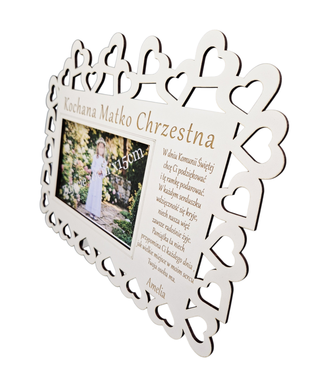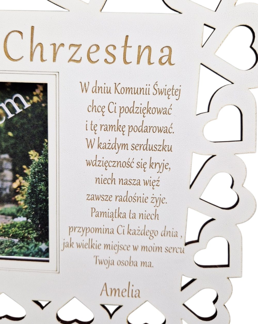 Szukasz prezentu, który nie wyląduje w szufladzie? Nasza personalizowana ramka to połączenie klasycznej elegancji z nowoczesnym wzornictwem. Otoczona subtelnym, ażurowym wzorem z motywem serduszek, stanowi idealną oprawę dla najważniejszych momentów z uroczystości Komunii Świętej.