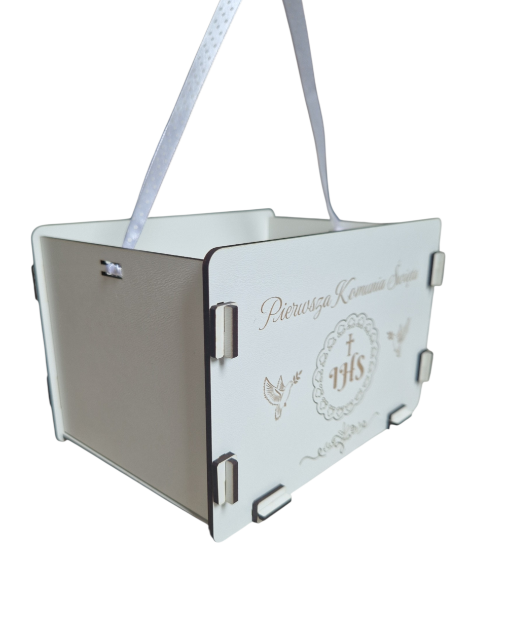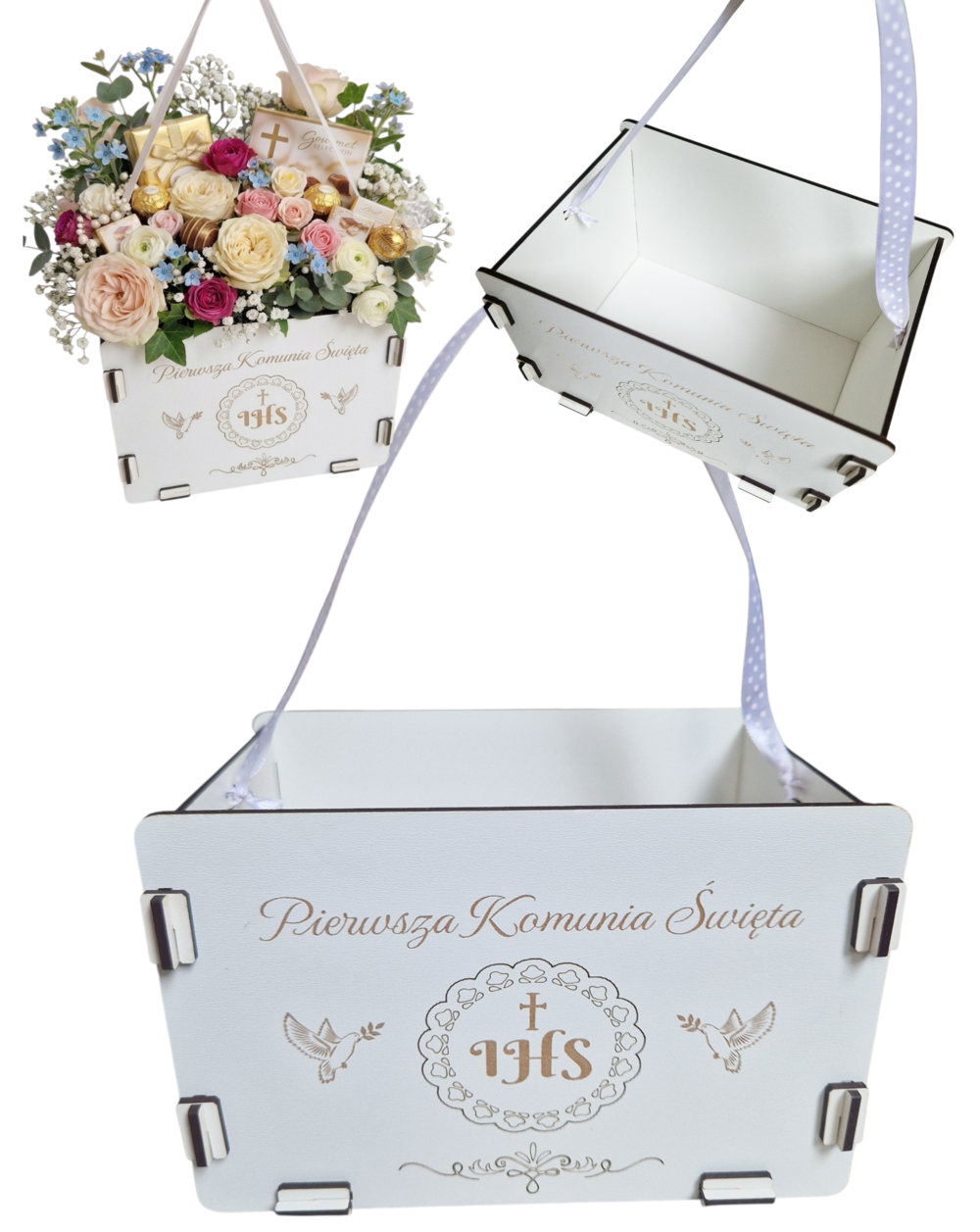 Elegancka baza do prezentu – stwórz własny upominek komunijny! Białe pudełko wykonane z płyty HDF z pięknym, grawerem „Pierwsza Komunia Święta”. Idealne jako baza do flowerboxa, koszyk na słodycze lub naczynie na drobny upominek. Stylowa wstążka w zestawie dodaje mu lekkości i uroku.