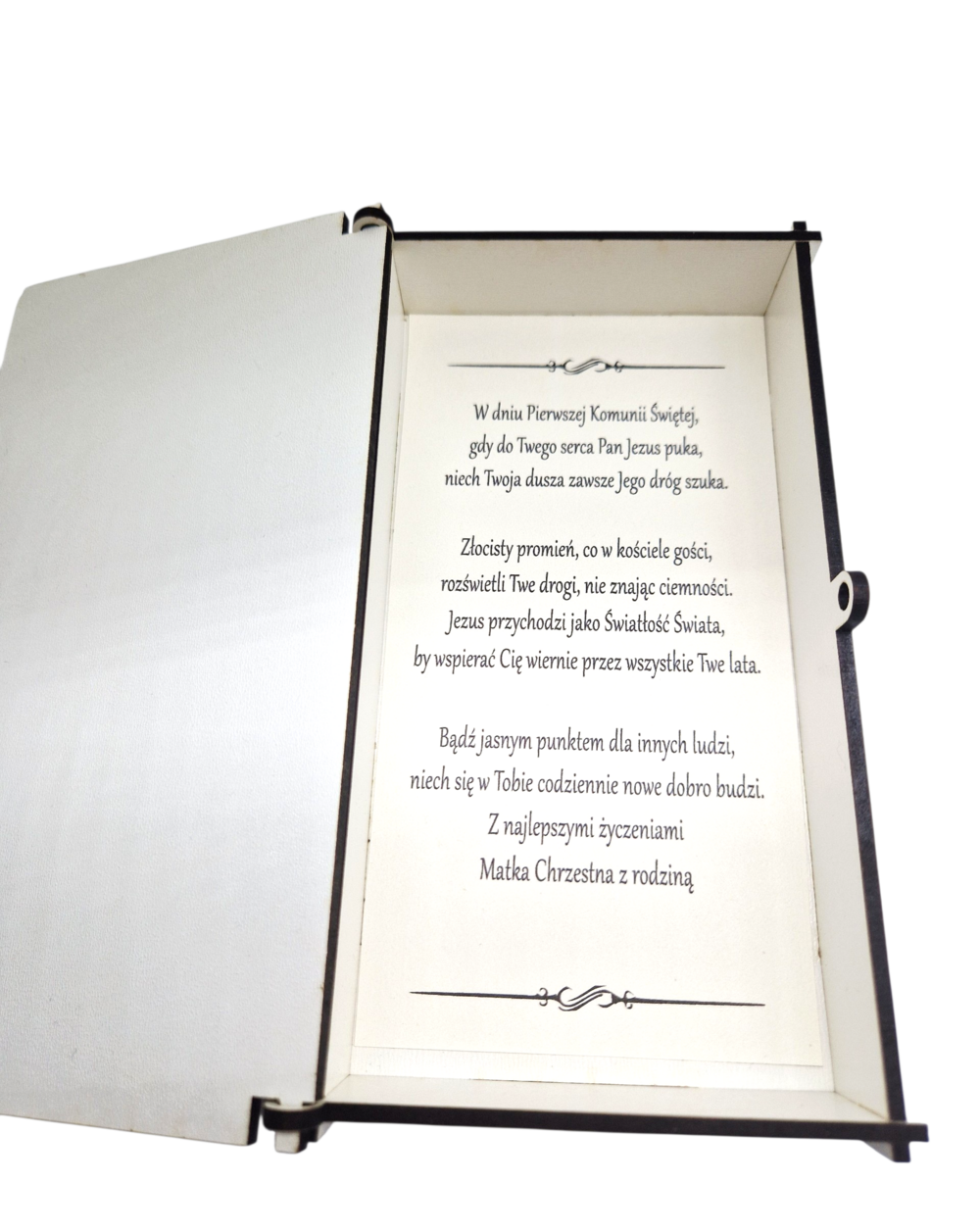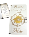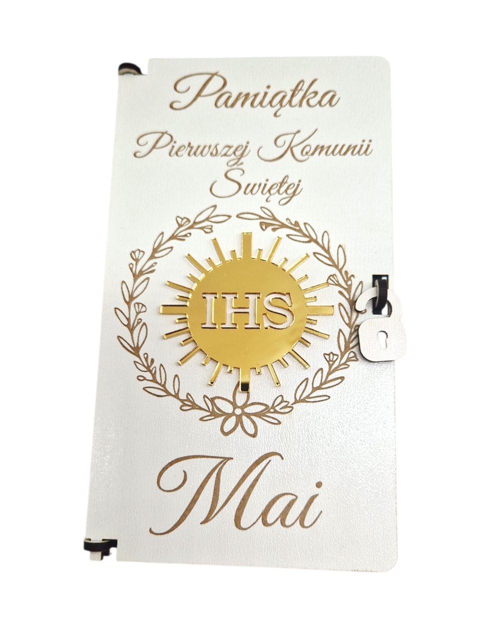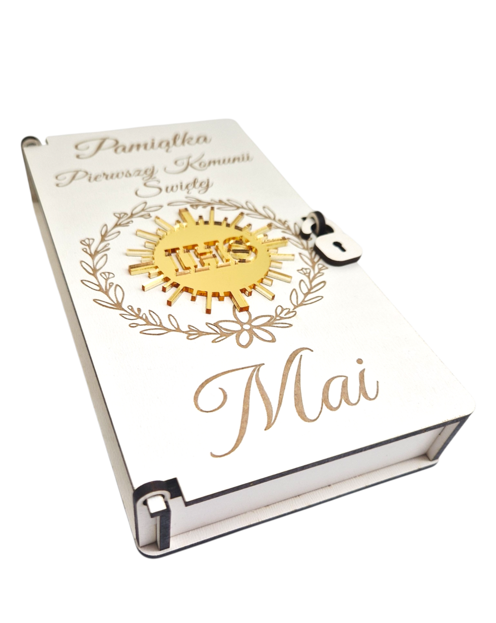 Eleganckie i nowoczesne pudełko komunijne wykonane z białej płyty HDF. Na froncie znajduje się lśniąca hostia z lustrzanej, złotej pleksi, która nadaje całości luksusowego charakteru. Wewnątrz znajdziesz piękne życzenia, które sprawią, że prezent stanie się niezapomnianą pamiątką na lata. Idealna alternatywa dla tradycyjnej koperty.