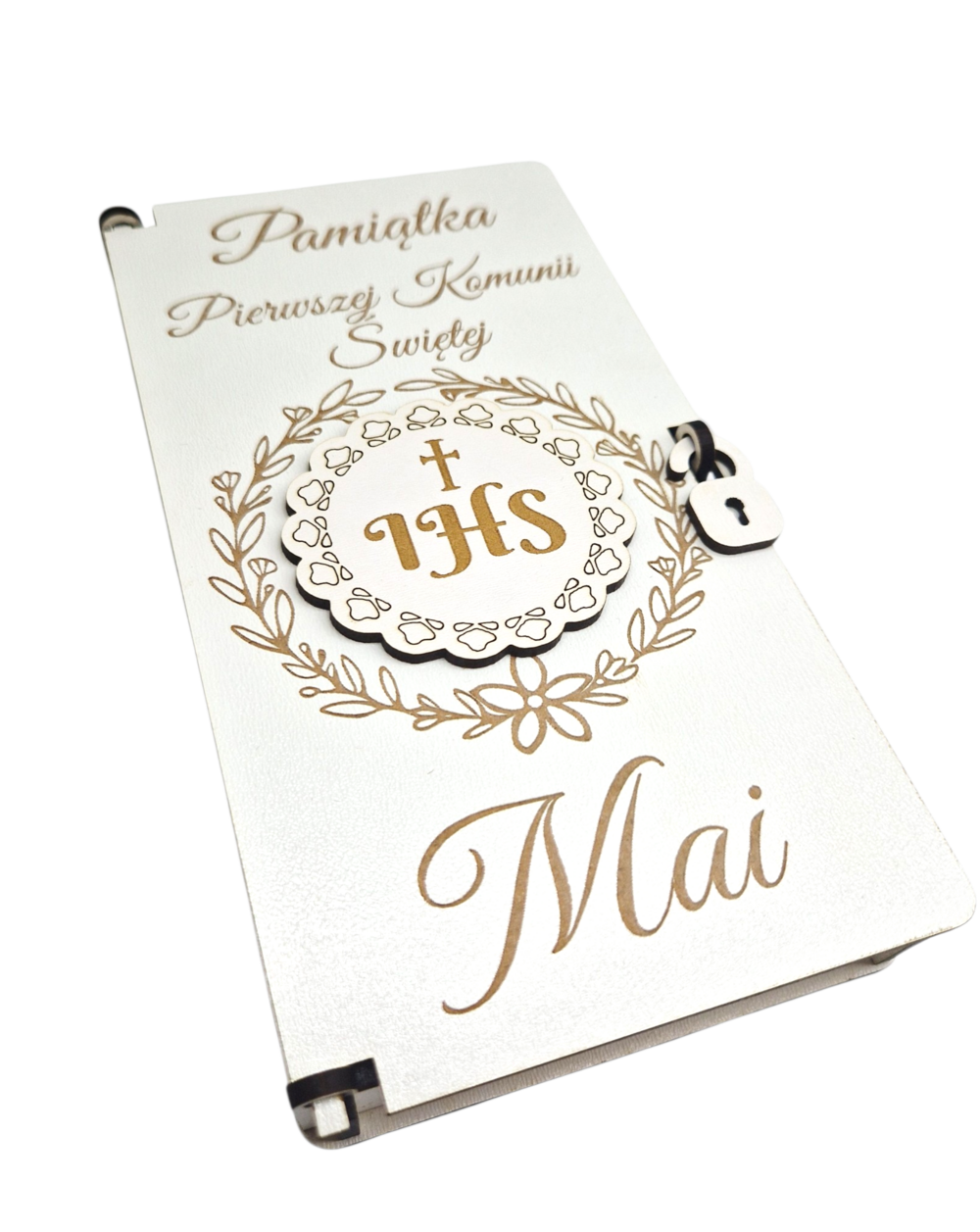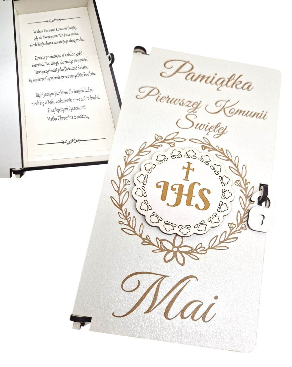 Eleganckie pudełko komunijne wykonane z białego HDF, łączące minimalistyczny design z tradycyjną symboliką. Na wieczku znajduje się grawerowany wianek z emblematem IHS oraz imieniem dziecka. Wnętrze skrywa piękną, gotową dedykację, co czyni je idealnym i kompletnym prezentem. Stylowy sposób na wręczenie gotówki lub drobnego upominku w dniu Pierwszej Komunii Świętej.