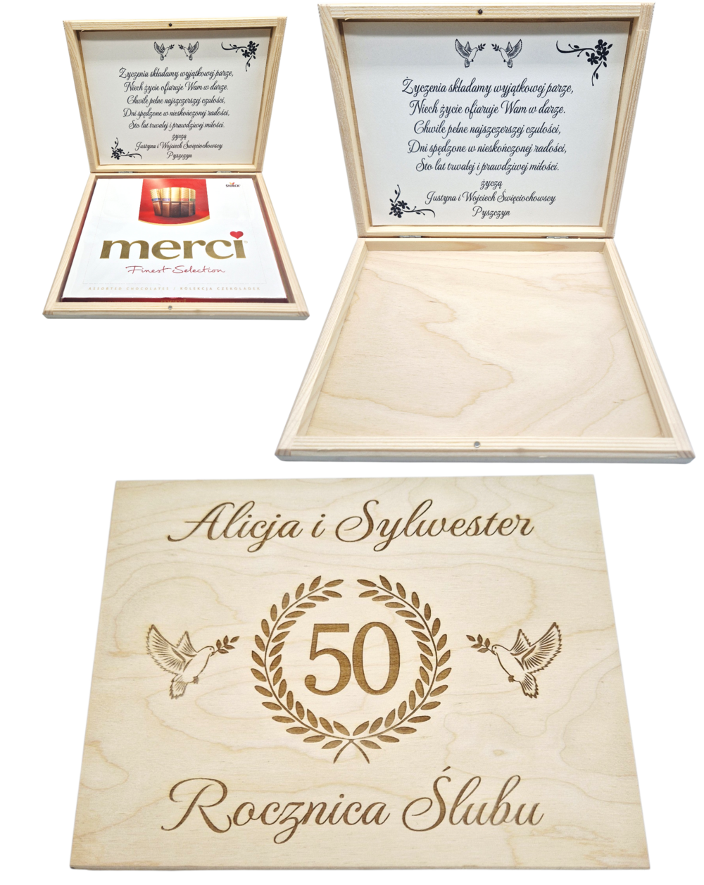 Personalizowane pudełko z naturalnego drewna to idealne połączenie prezentu i trwałej pamiątki. Na wieczku wykonujemy precyzyjny grawer, a wewnątrz umieszczamy elegancką wkładkę z Twoimi życzeniami. Pudełko jest idealnie dopasowane do popularnych czekoladek Merci, tworząc z nimi luksusowy zestaw.